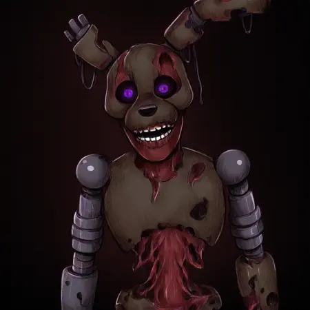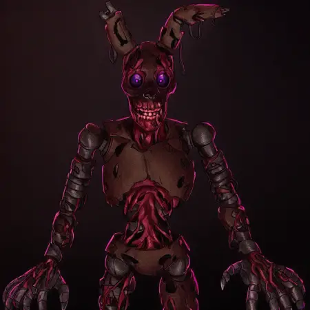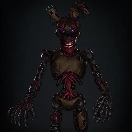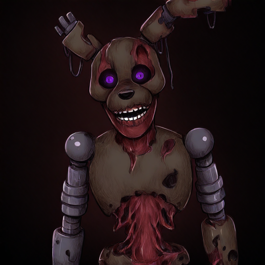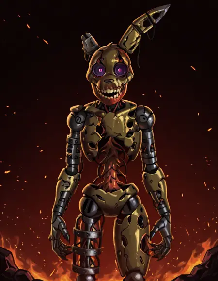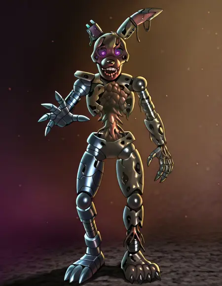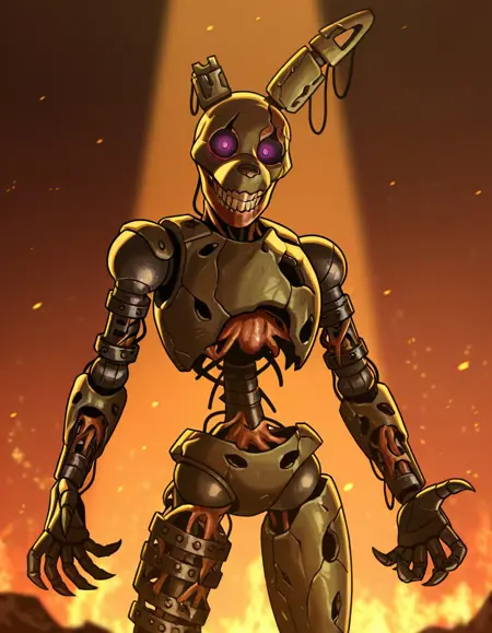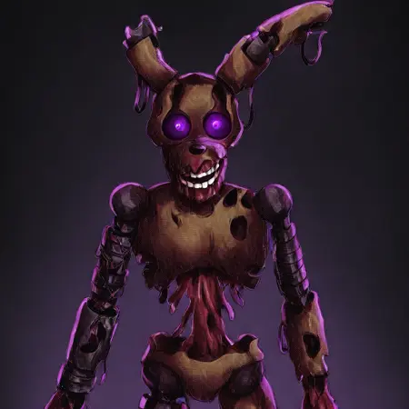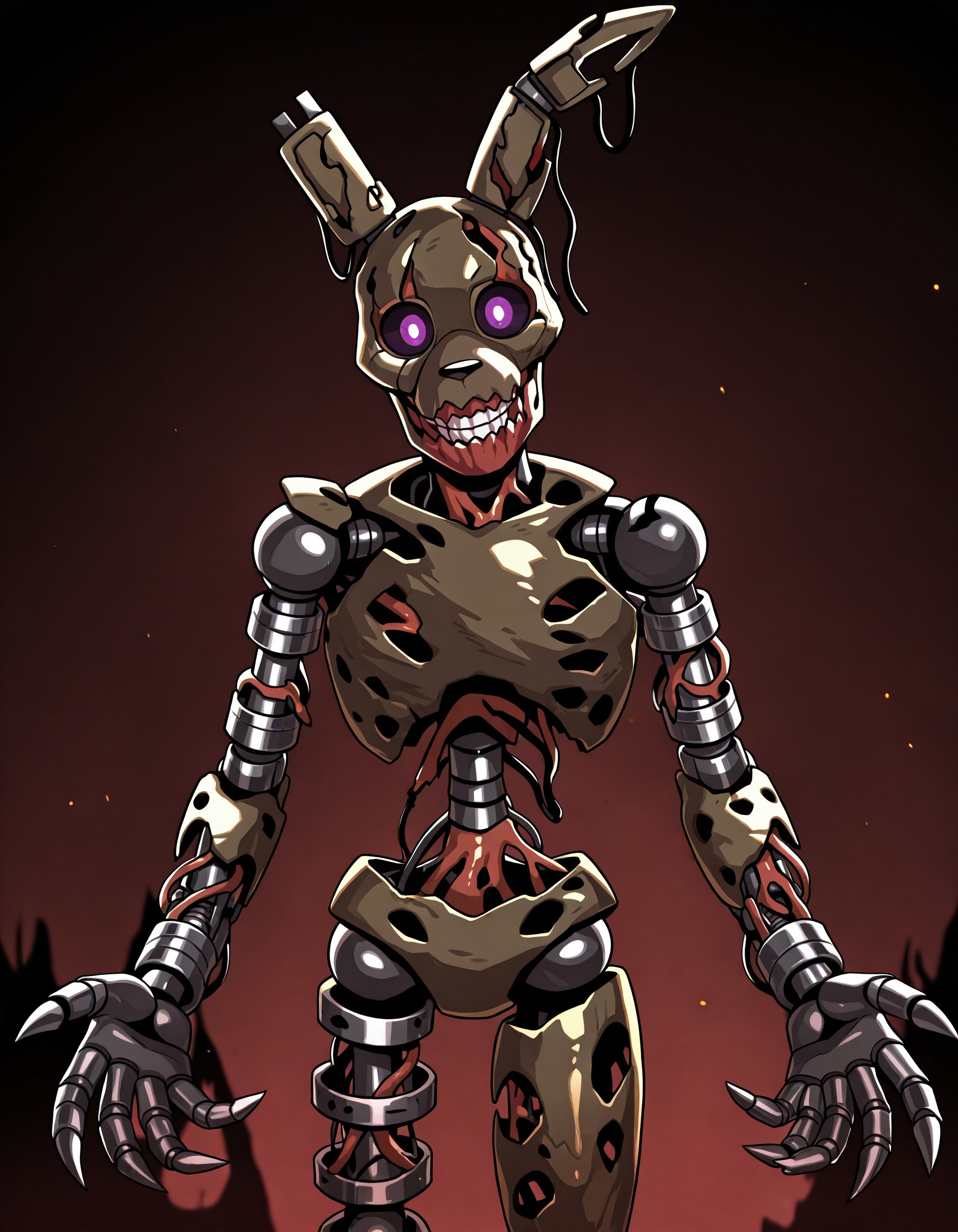 Animatronics, dead corpse in a robot, visible teeth, purple eyes, shiny eyes, flesh, robot rabbit, metal arm, clawed hand, iron spine, hole in body, burnt metal body, ochre body, visible viscera, visible tendons, left ear damaged