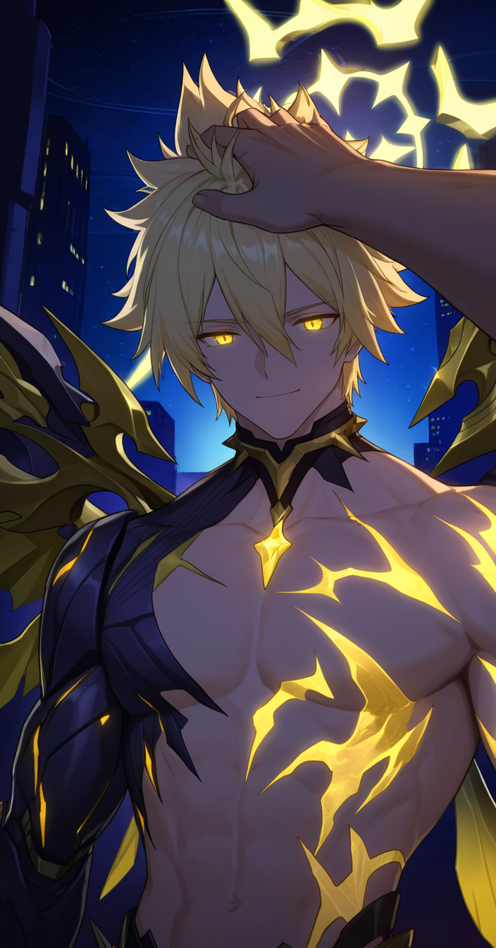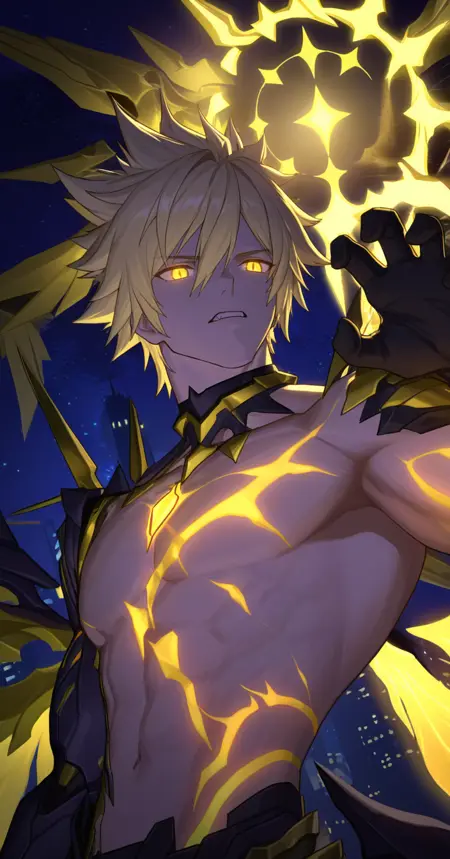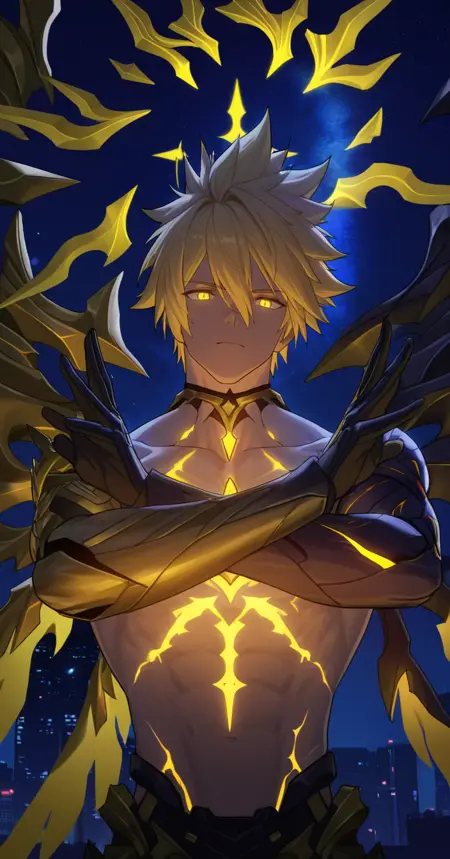 baiezd, yellow eyes, blond hair, halo, topless_male, armor, chest jewel,spiked hair,mechanical wings,two-tone_wings, glowing eyes, glowing_tattoo,