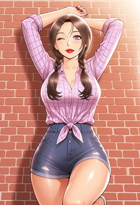 8. ((open white shirt, sexy black camisole, obscene cleavage, huge cleavage, denim shorts, ))