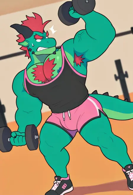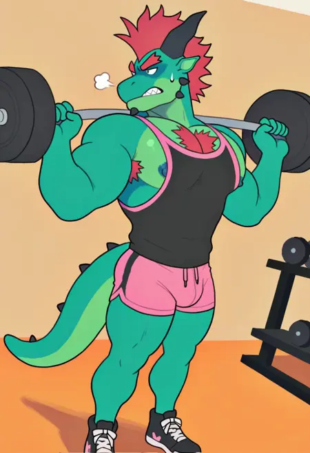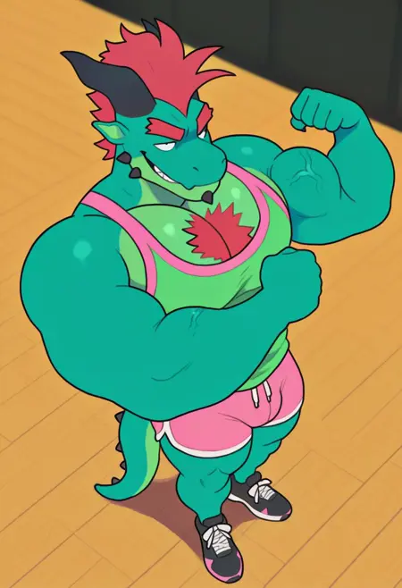 強化プロンプト:「ドラゴン、尾、うろこ、緑の肌、赤いモヒカン、赤い胸毛、黒い目、筋肉質、男らしく、成熟した、大きな胸筋」