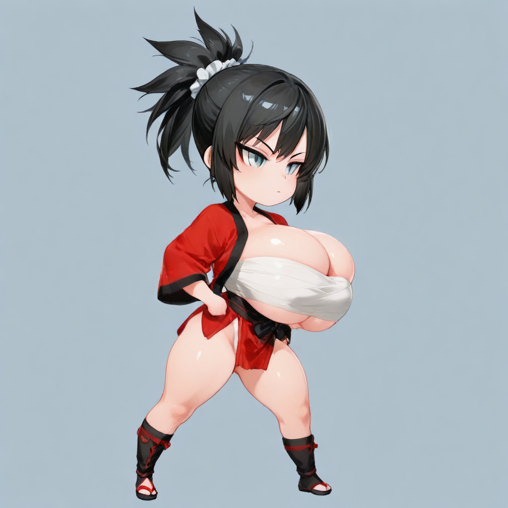 black hair,ponytail, grey eyes, black eyes, scrunchie,tsurime,