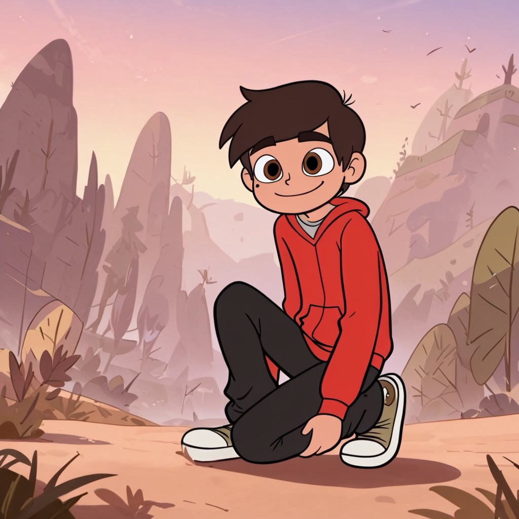 | 학습된 단어 | Marco, 1boy, solo, mole under right eye, brown eyes, brown hair, hood, red hoodie, black pants, eyebrows, olive and white sneakers, slender build, tan skin, black framed glasses, dark orange sweater vest, light blue collared shirt, light blue pants, long sleeves, 복사됨! |