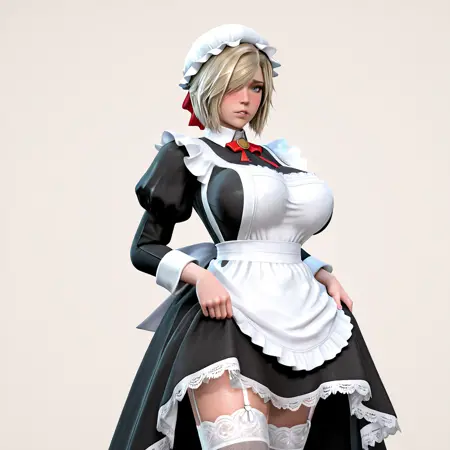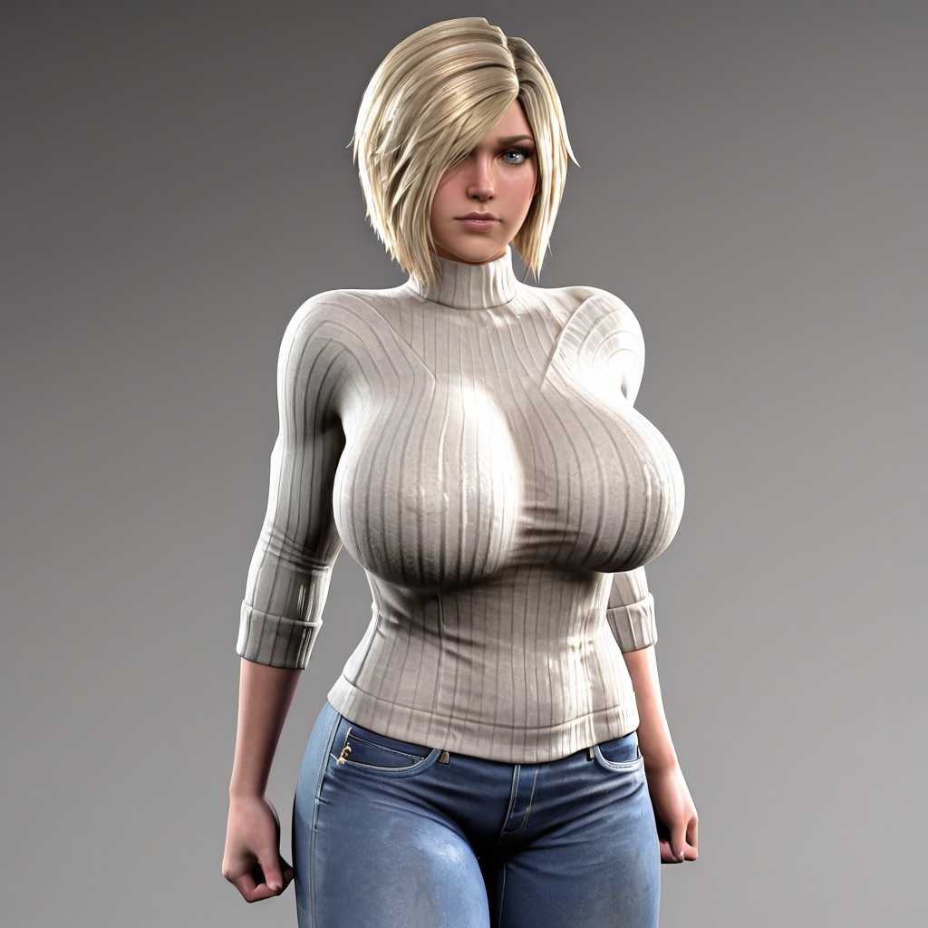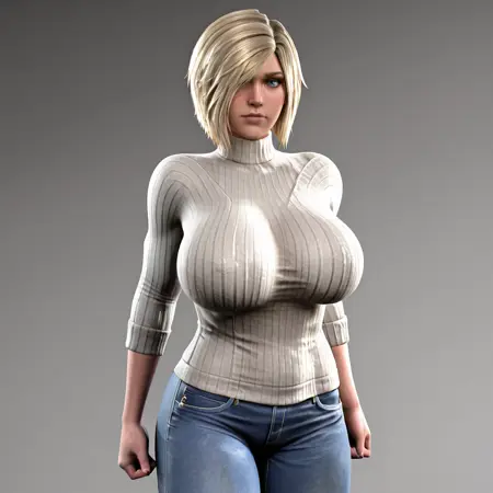 Trigger with classic outfit:PowerGirlInjustice2Classic, 1girl, large breasts, cleavage cutout, clothing cutout, blonde hair, red cape, blue eyes, belt, white leotard, superhero, short hair, highleg leotard, hair over one eye, turtleneck, thigh gap, cowboy shot,3d