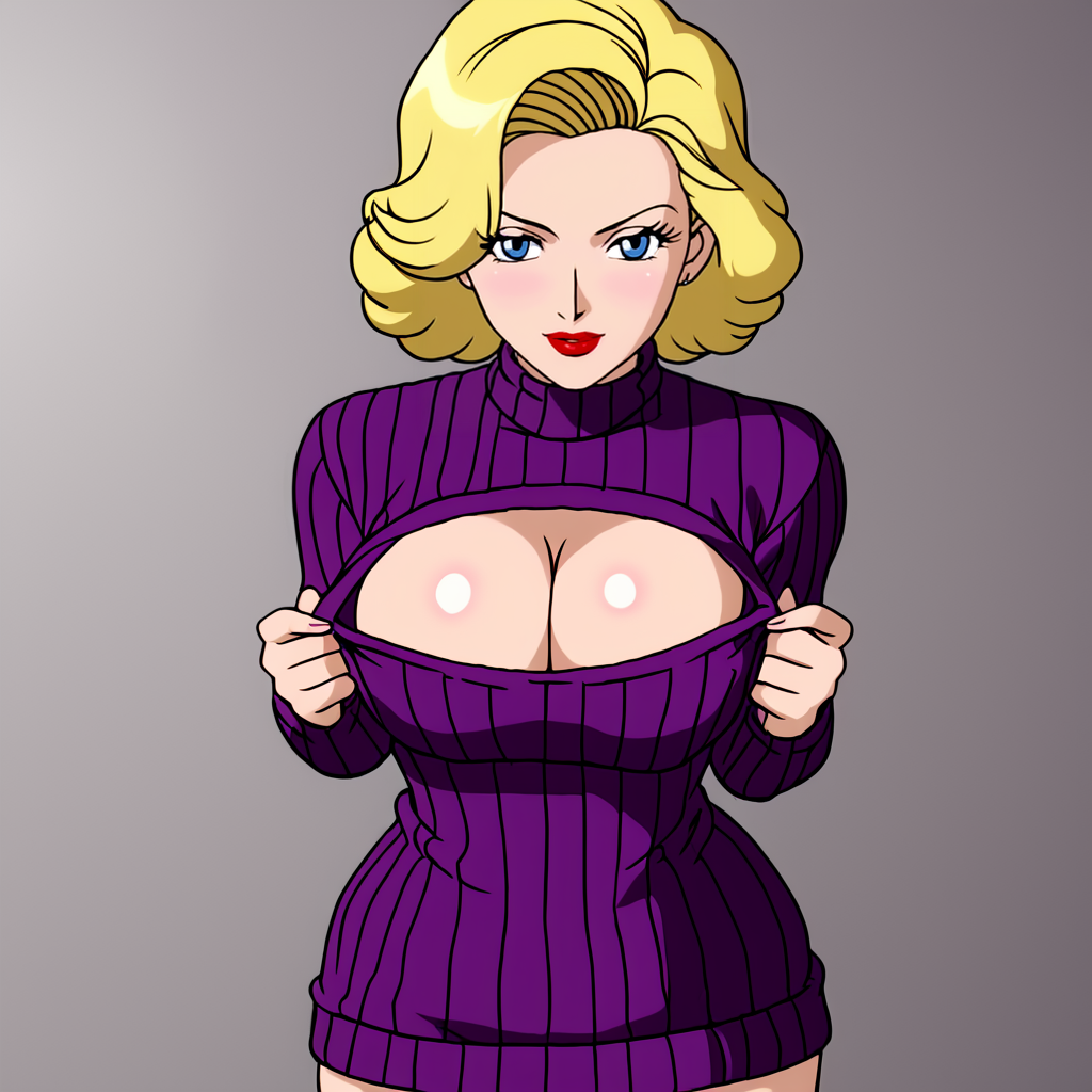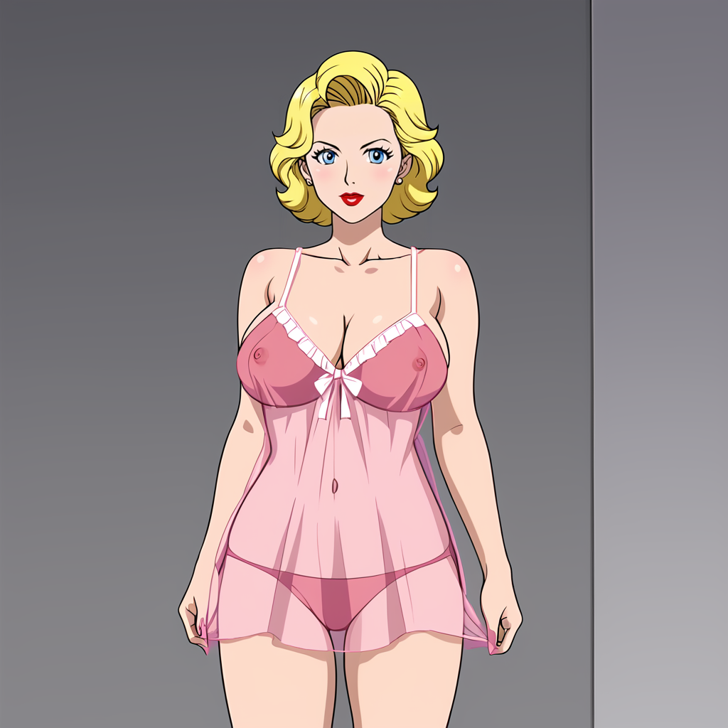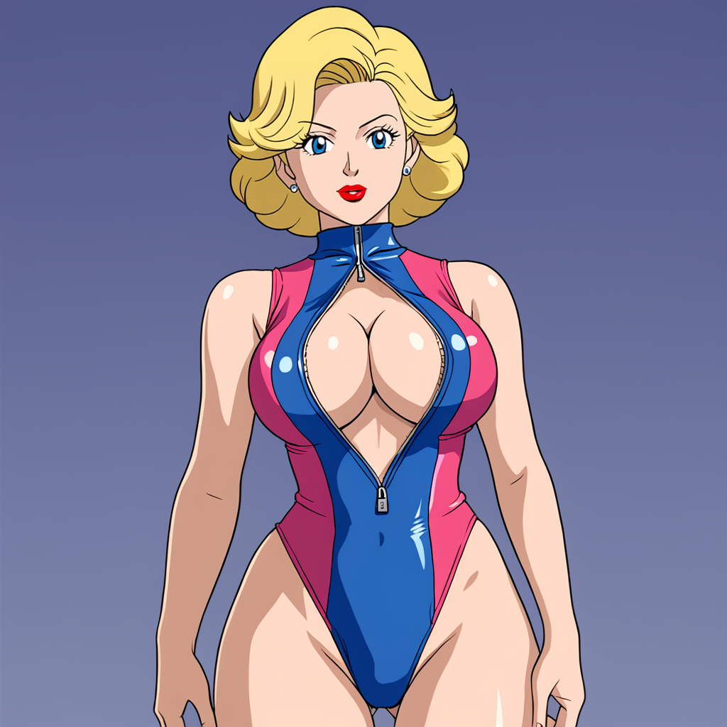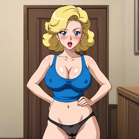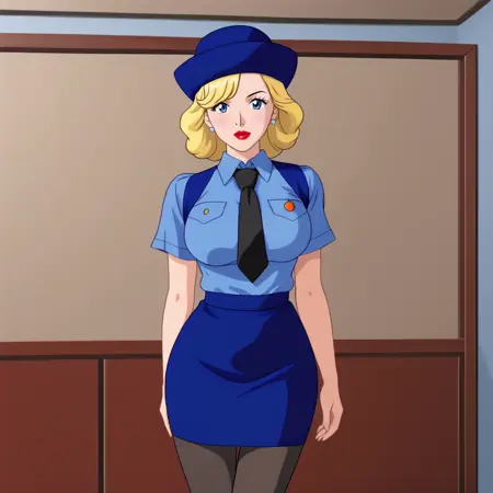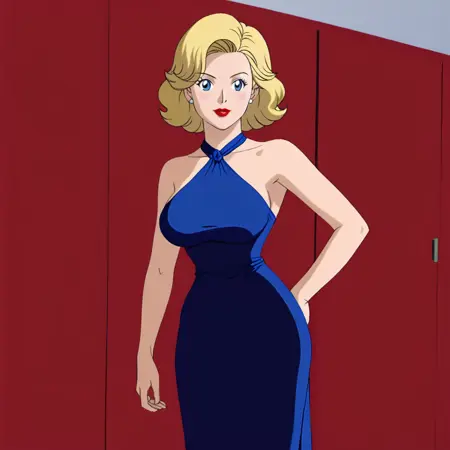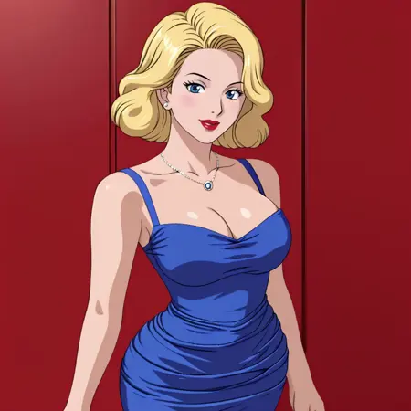 Trigger : MirandaCurtis, 1girl, blonde hair, large breasts, cleavage, formal, blue suit, lipstick, short hair, makeup, blue eyes, mature female, cowboy shot