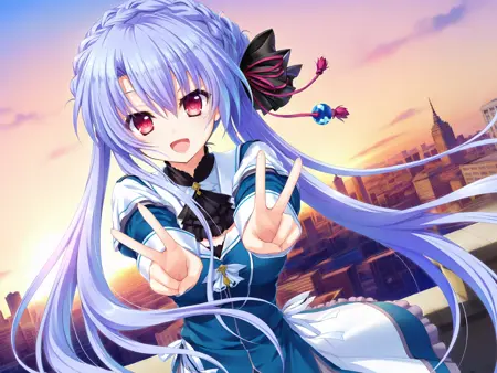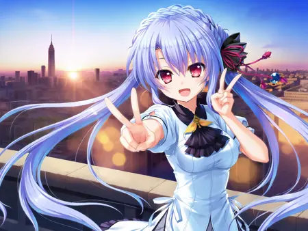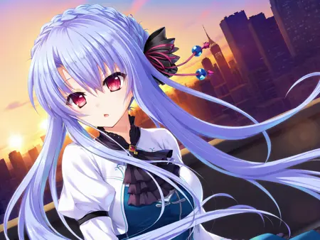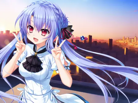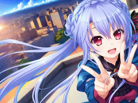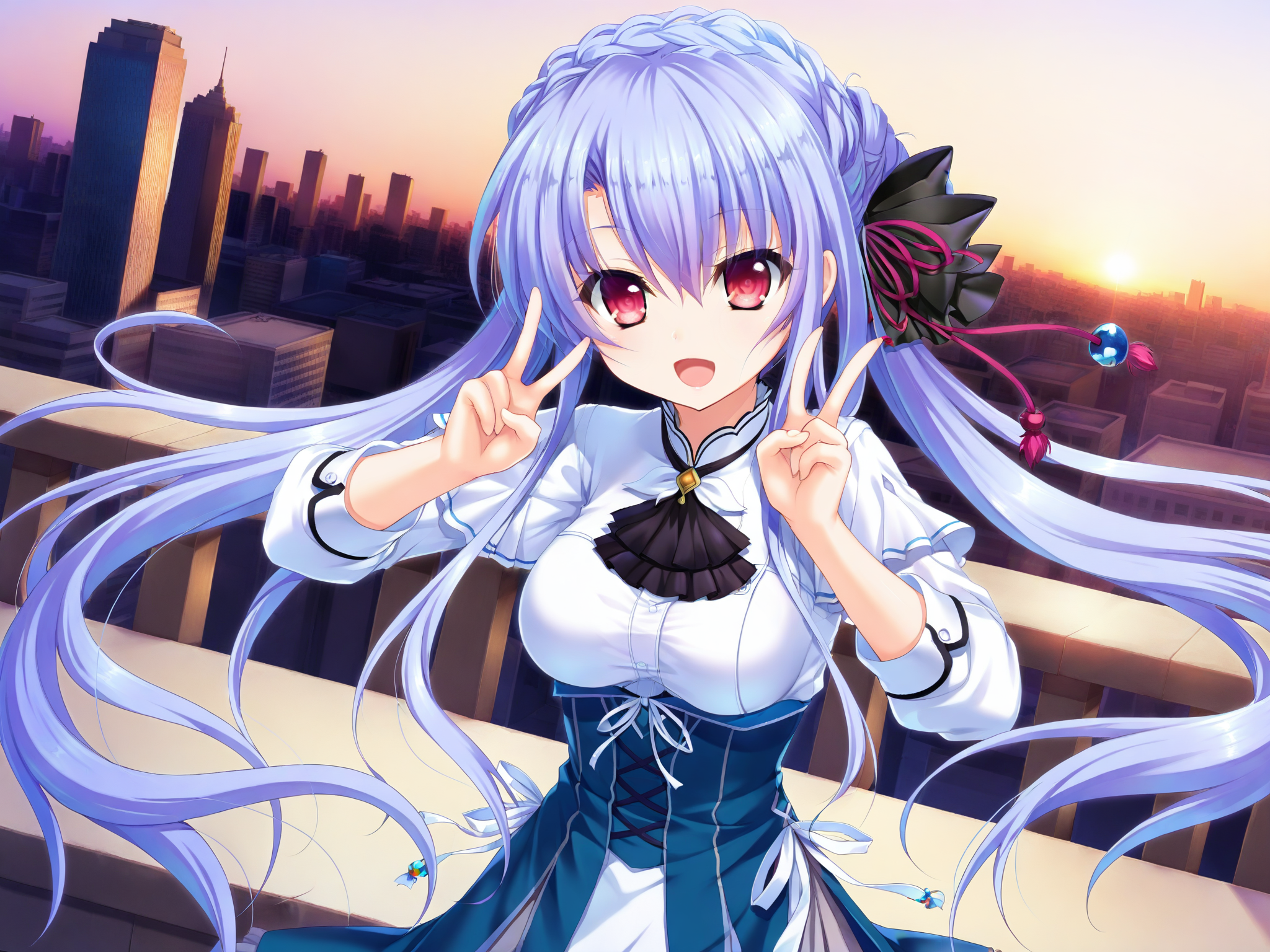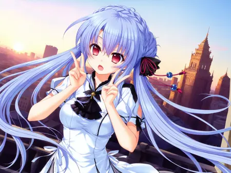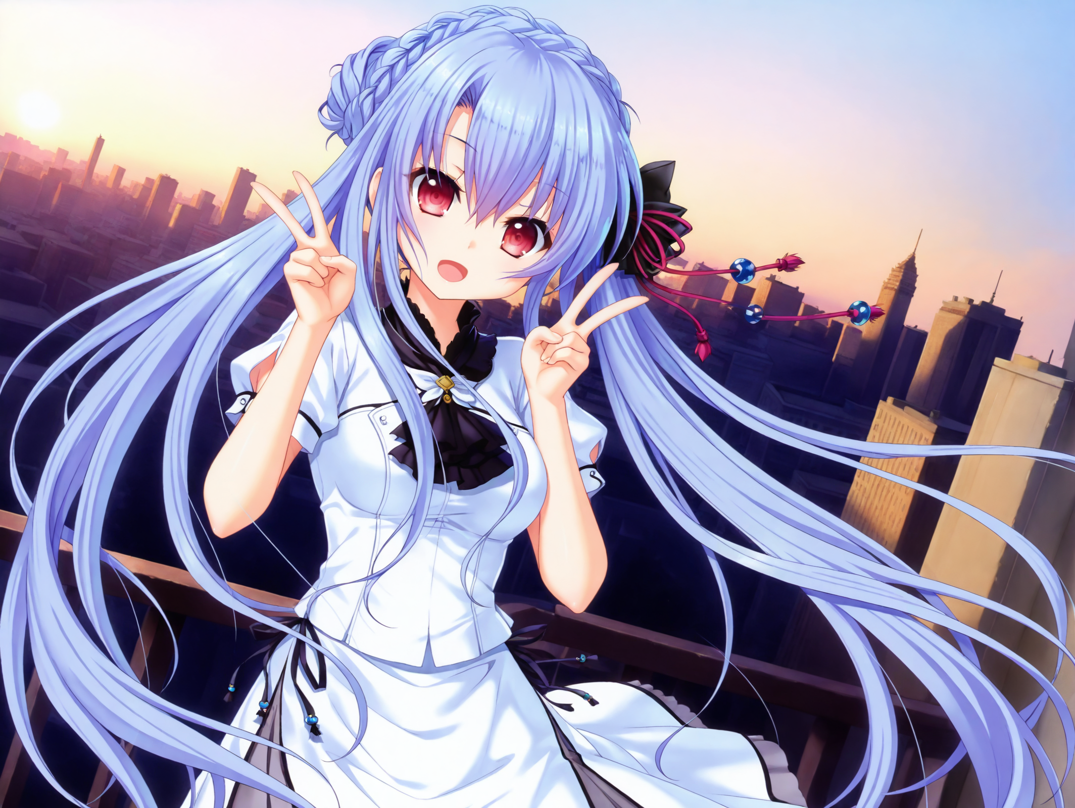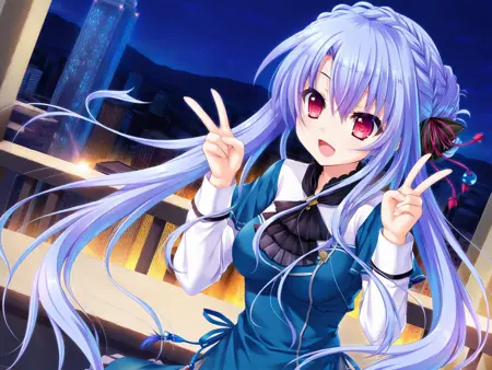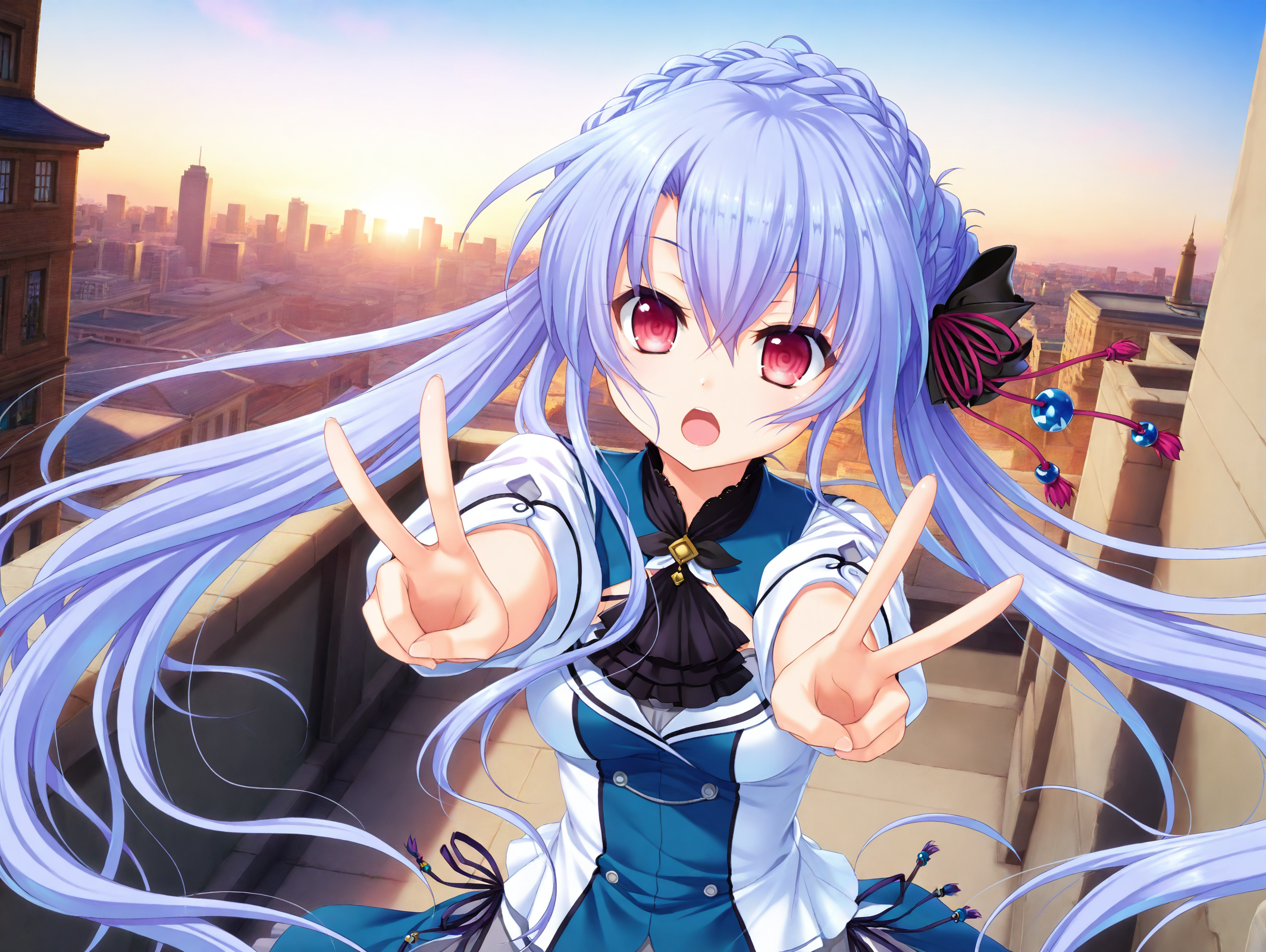 wallpaper,lora:SorakadoAo2:0.8,1girl,hair between eyes,very long hair,blue hair,hair between eyes,open mouth,blue hair,tassel hair ornament,hair bow,black bow,floating hair,red eyes,crown braid,ascot,black ascot,hair bun,twintails,braided bun,cityscape,double_v,cowboy_shot,