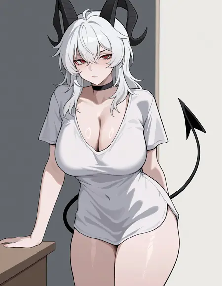 z1n_alt · 長い髪 · · 前髪 · 大きな胸 · シャツ · 赤い目 · 乳首の露出 · 目の中の髪 · 肩の露出 · ジュエリー · 鎖骨 · 白いシャツ · ahoge · 灰色の髪 · ピアス · · ノースリーブ · チョーカー(黒) · ベルト · 破れた服 · 目の下のほくろ · 胸のほくろ