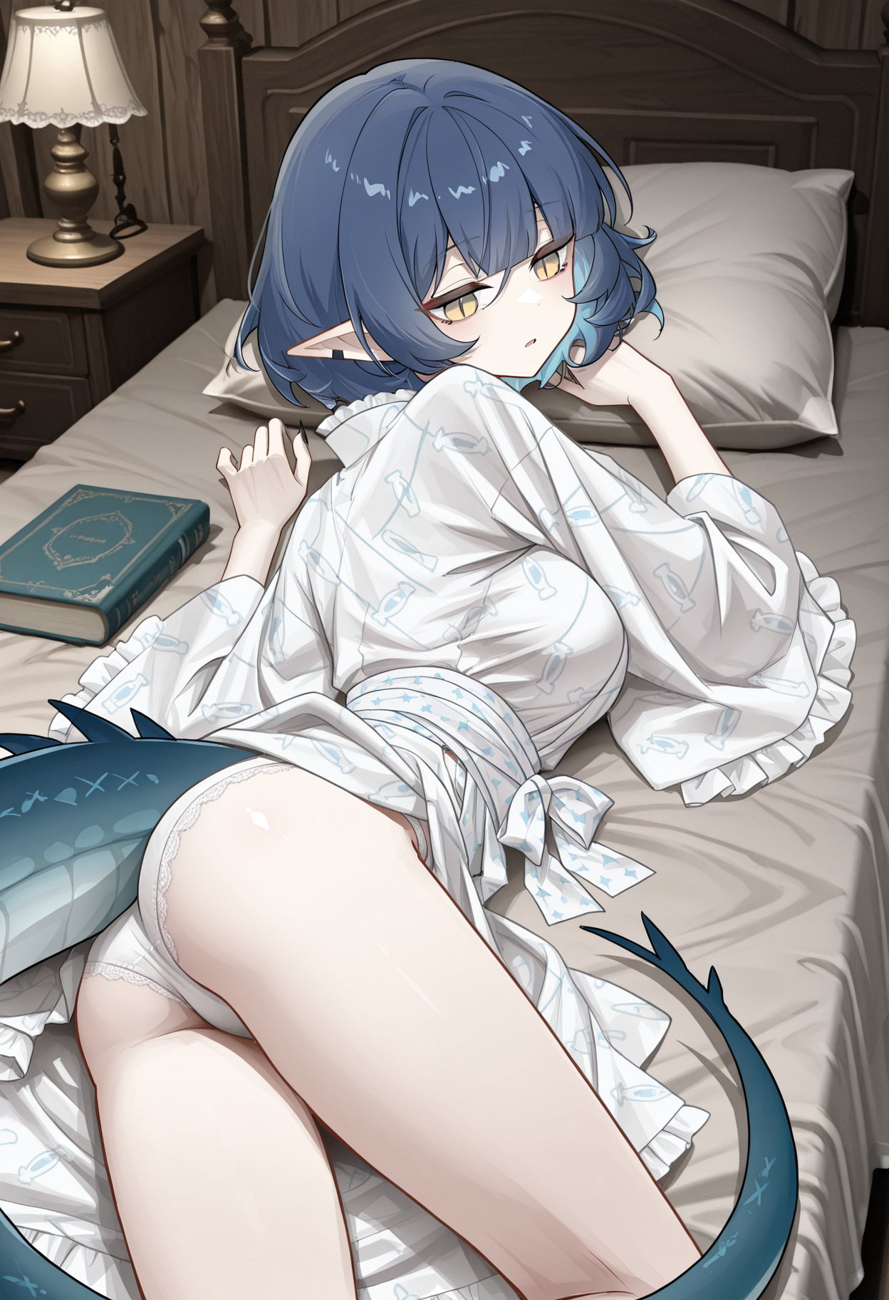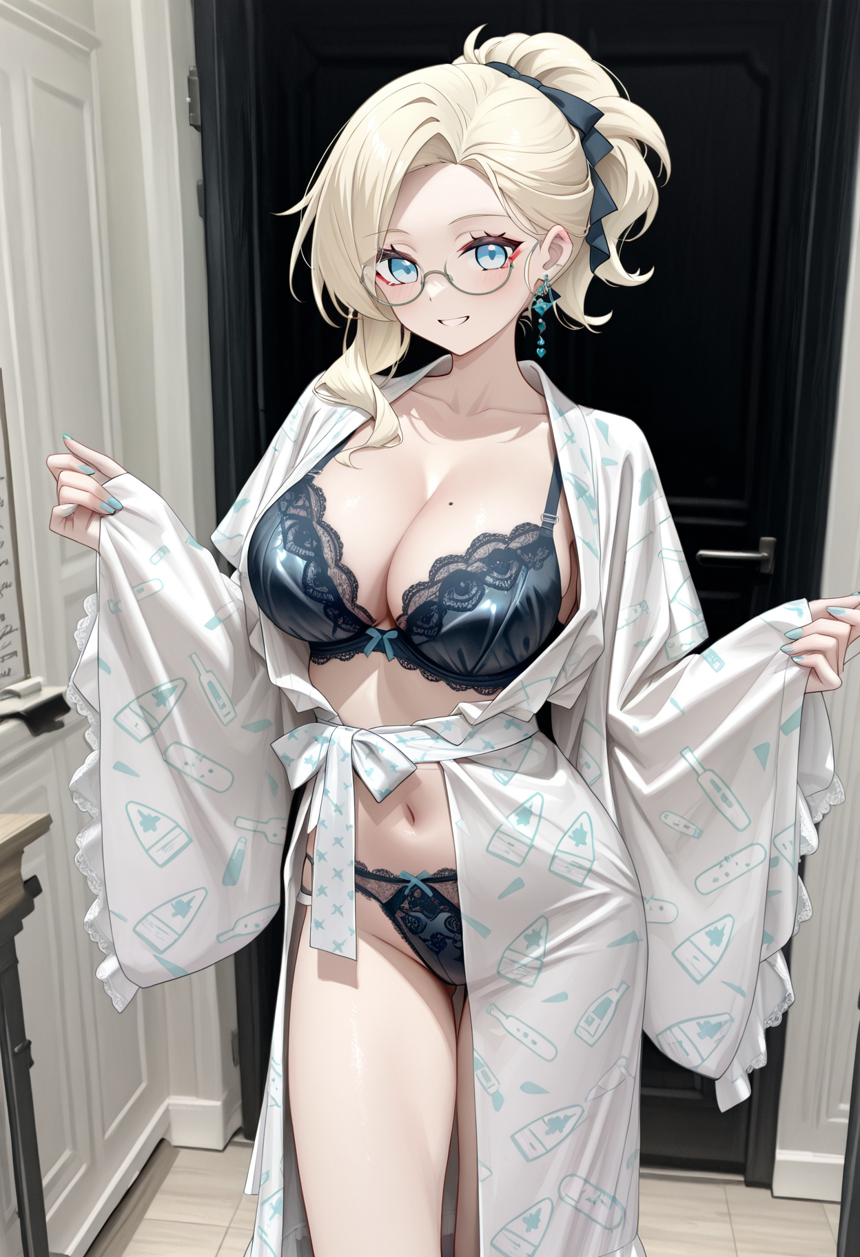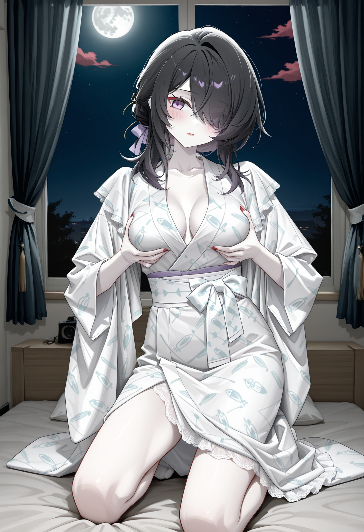 트리거 단어: 긴 소매, 넓은 소매, 레이스, 프릴, medkimono1, 기모노, 일본 옷, 벨트, 리본, (medicalcute print):1.6, 흰 기모노,