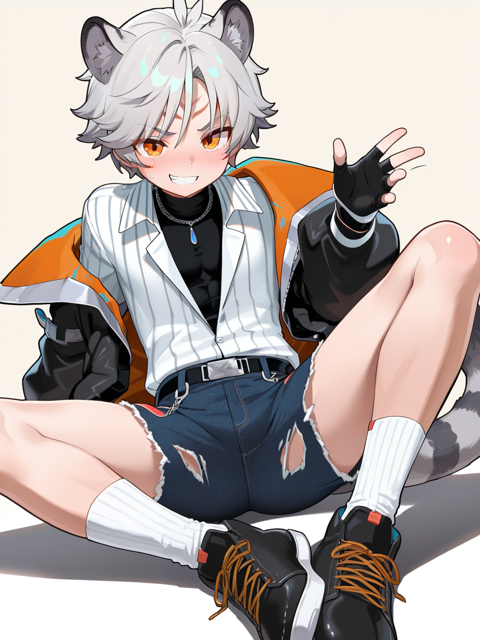 新しい服:灰色の髪、短い髪、オレンジの目、動物の耳、指抜き手袋、手袋、白いシャツ、ストライプ、ストライプシャツ、縦縞、黒のタートルネックシャツ、ジュエリー、ネックレス、黒いジャケット、フードなし、開いたジャケット、長い袖、手首より長い袖、青いショートパンツ、カットオフ、デニム、破れたズボン、破れたショートパンツ、尾、白い脚部、白い靴下、黒い足元