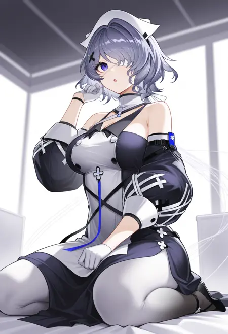 公式衣装、ドレス、肩出し、ふんわりした袖、白いパンティストッキング、分割色パンティストッキング、黒白パンティストッキング、手袋、ナースキャップ