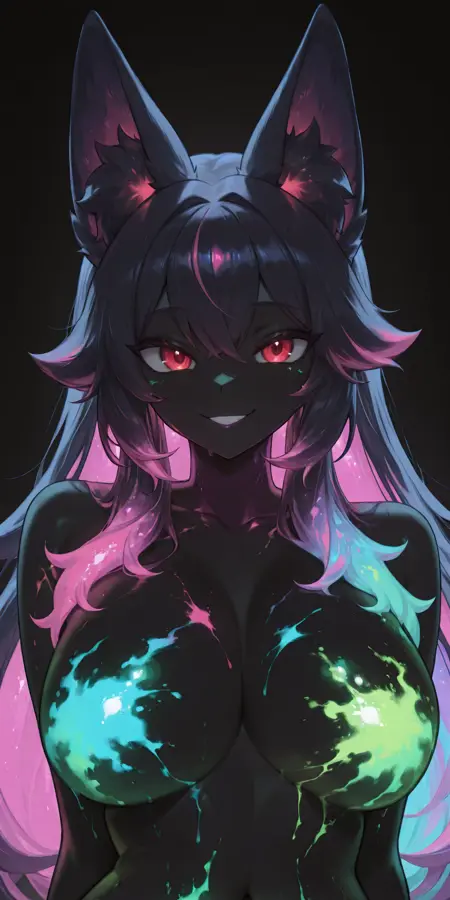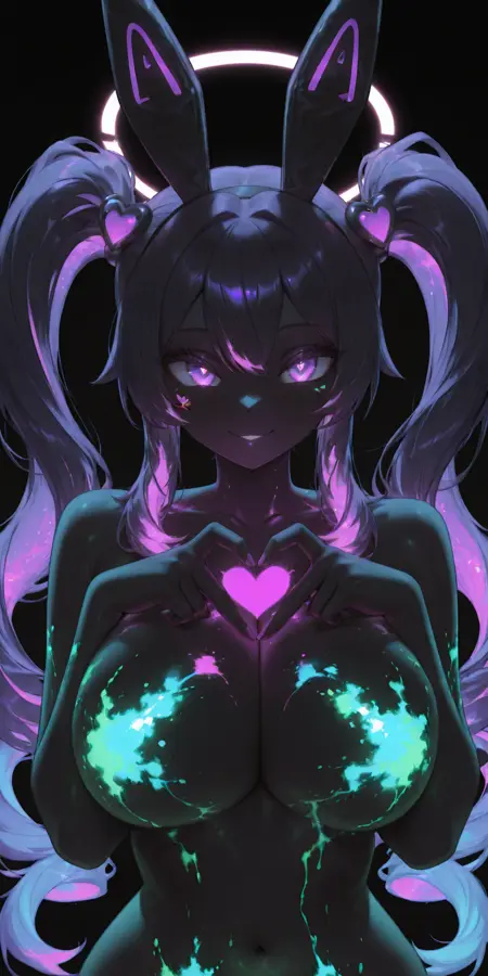 ultraviolet light,black background,bodypaint,glowing eyes,glowing hair,glowing,multicolored...
