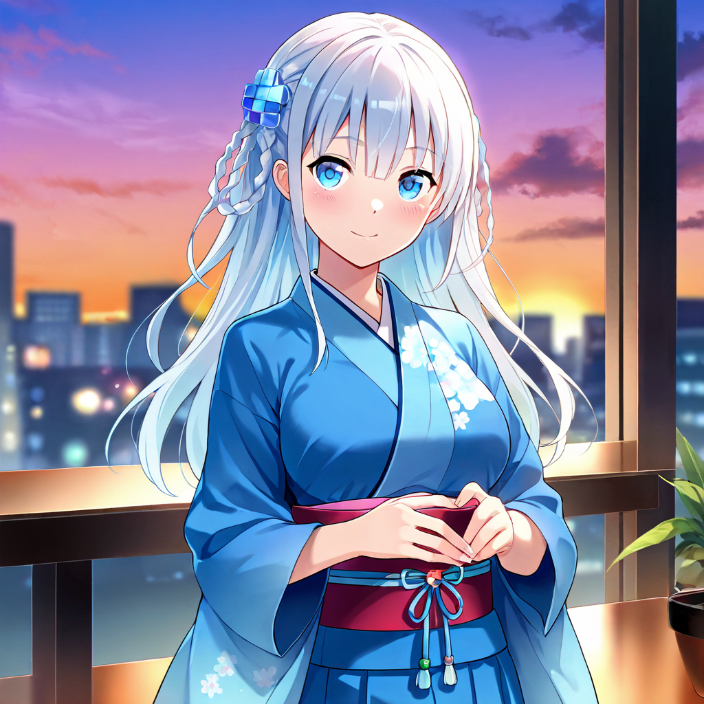 Basic Triggering Terms: 1girl,Madobe Touko,silver hair,hair ornament,blue eyes,white school uniform with a pleated skirt,white kneeboots