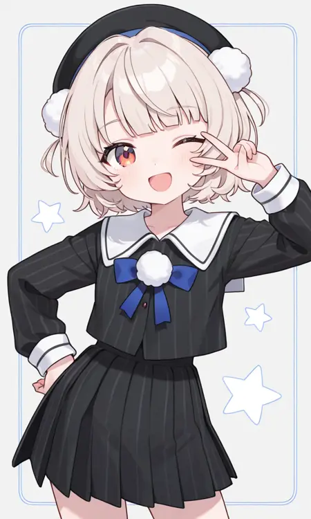 voisona ui, short hair, pom pom hair ornament, beret, black headwear, vertical-striped clothes, black shirt, white sailor collar, blue bowtie, sleeve cuffs, black skirt, pleated skirt