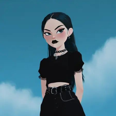 インスタグラムのバディーのようなエネルギーをまじえたスムーズなカートoonスタイル。洗練されたライン、ツヤのある肌、きりりとした眉、常に決まるファッション。照明はドラマチックで、影は柔らかく、色は豊かだが派手すぎない。