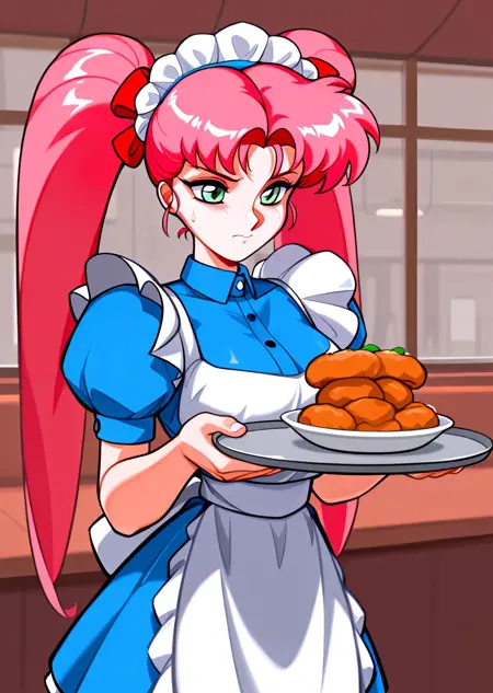 마나미 - ManamiKVG, 초록색 눈, 더블테일, 분홍색 머리카락, 메이드 헤드기어, 파란 드레스 (원한다면 발가락 장갑을 추가하세요)