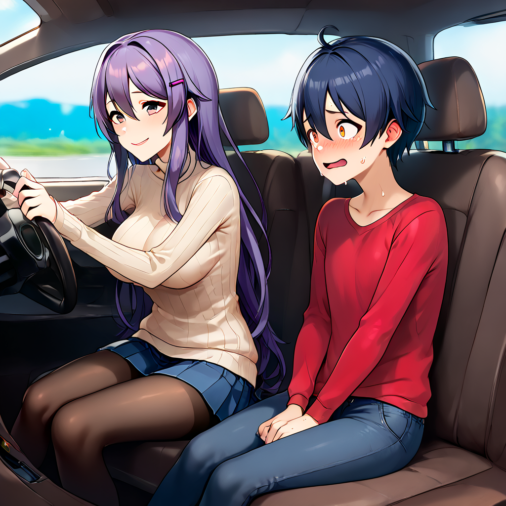cmnfdrive,1girl,1boy, seatbelt, car seats, clothed male nude female, steering wheel, /n 1boy, /n 1girl,