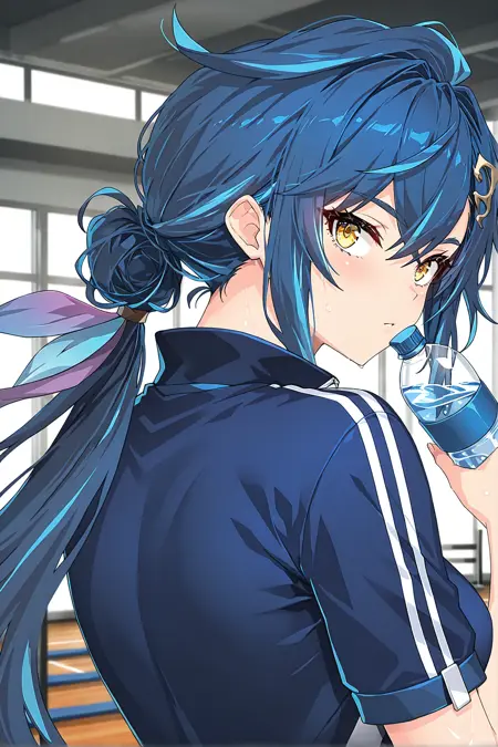 golden eyes, navy blue hair, long hair, low-tied ponytail, hair ornament, large breasts, off-shoulder white shirt, black fingerless gloves, midriff, navel, navy blue sport pants, white sneakers