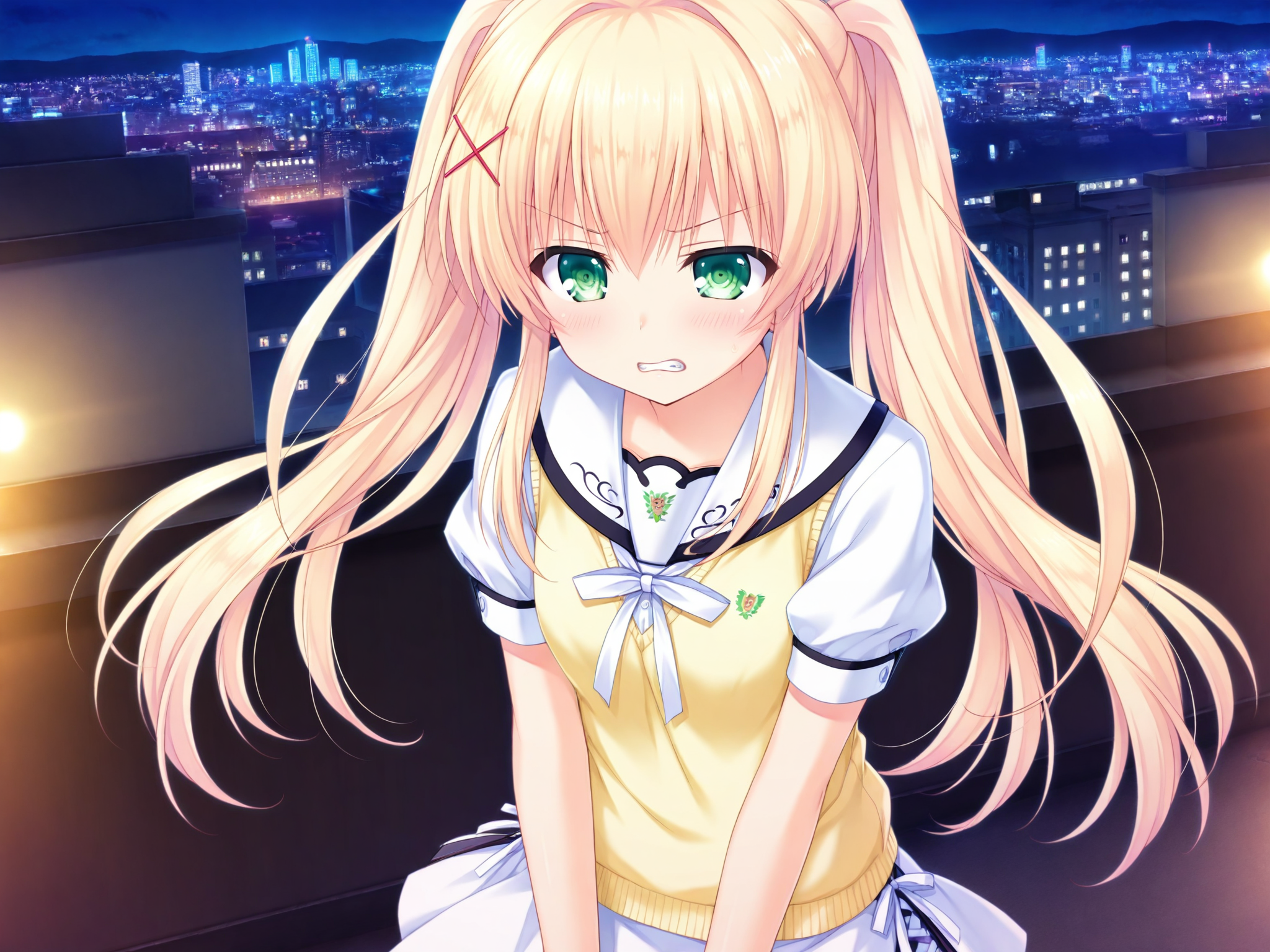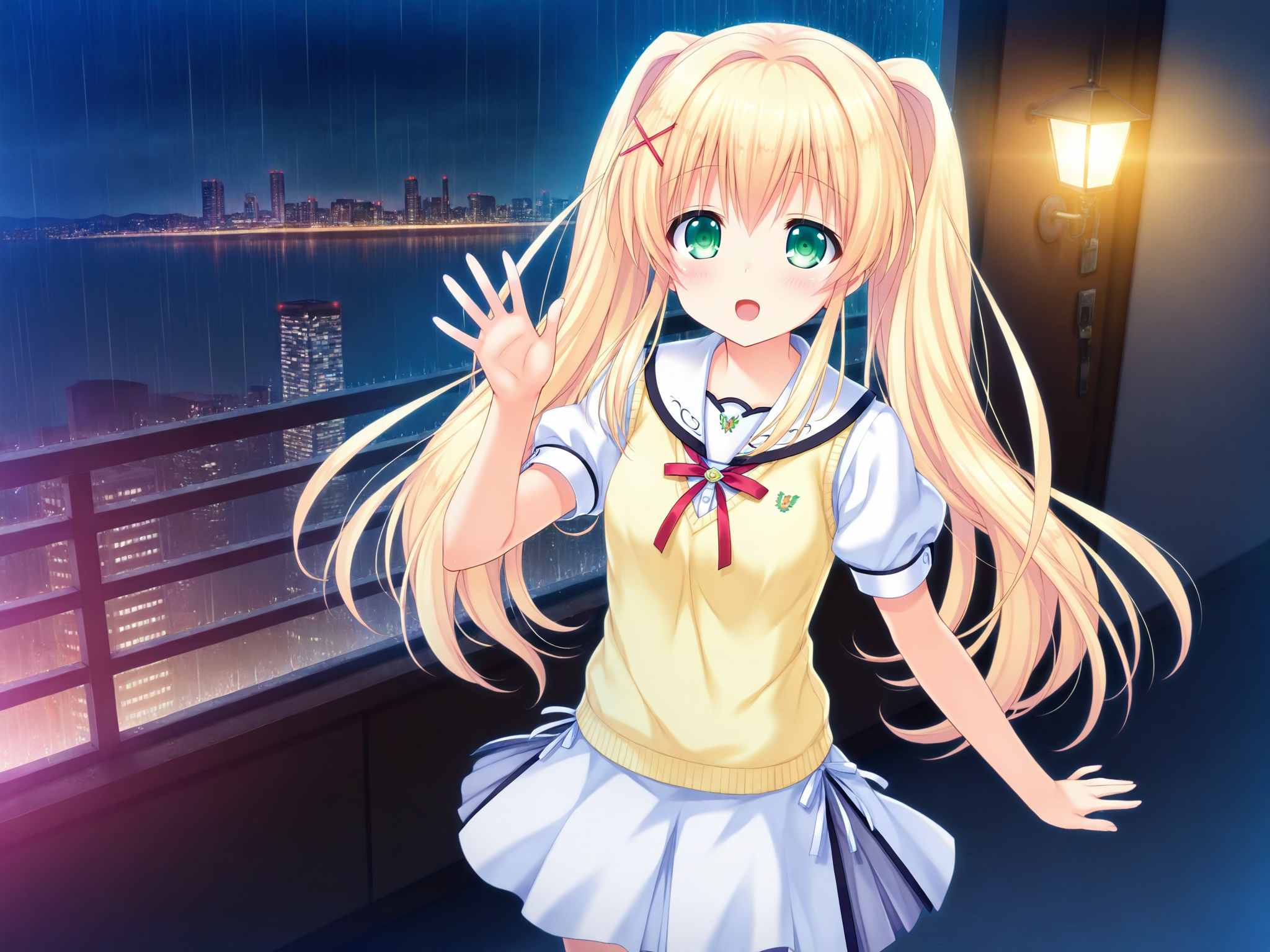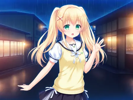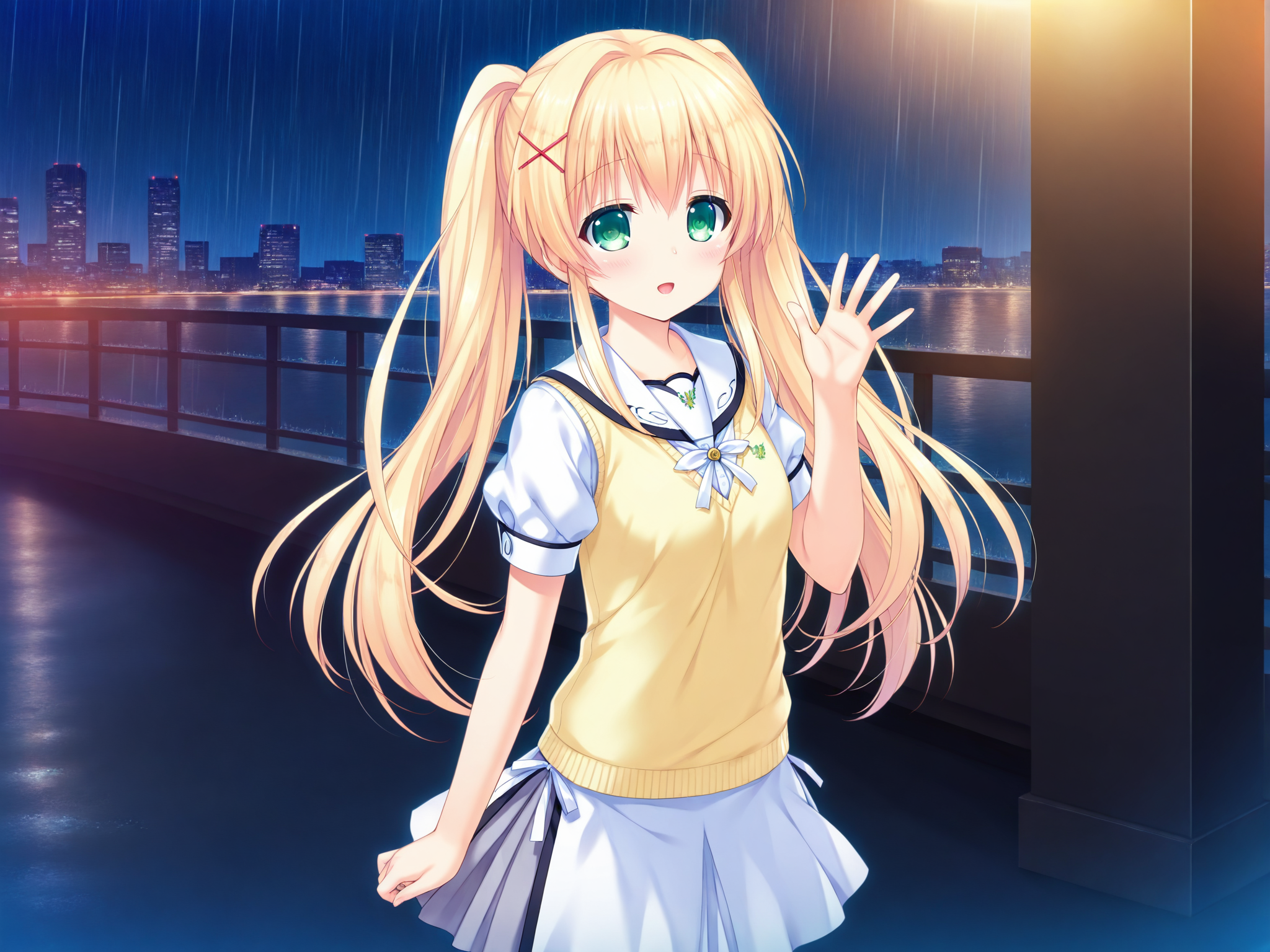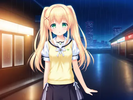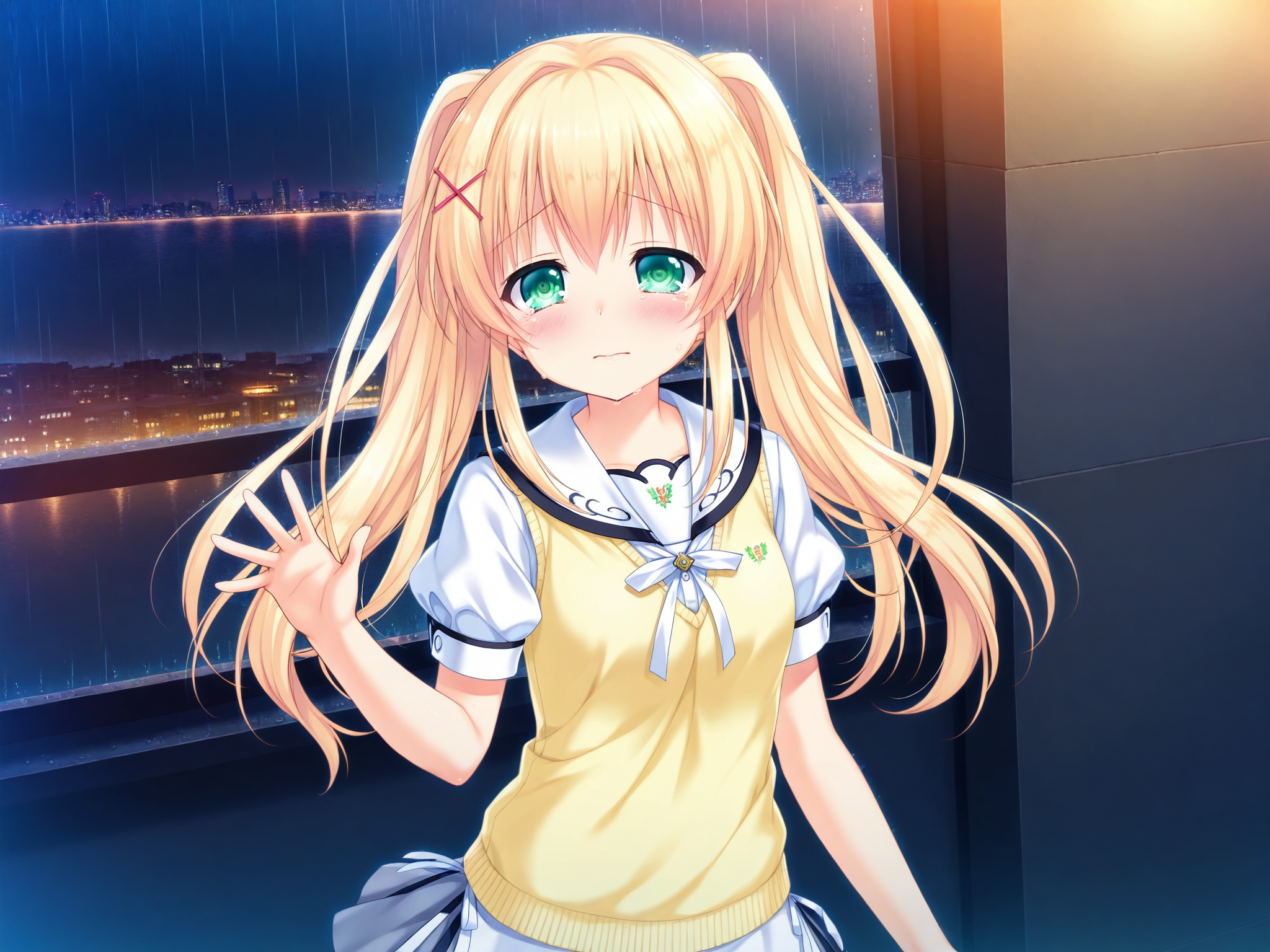 full_shot,game cg,more details,wallpaper,Cinematic Lighting,lora:TsumugiWenders:0.7,1girl,solo,yellow sweater vest,blonde hair,twintails,green eyes,x hair ornament,blush,skirt,white sailor collar,puffy short sleeves,white shirt,miniskirt,sidelocks,cityscape,waving_arms,night,rain,crying,