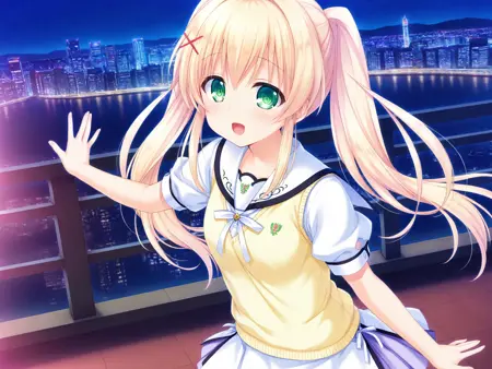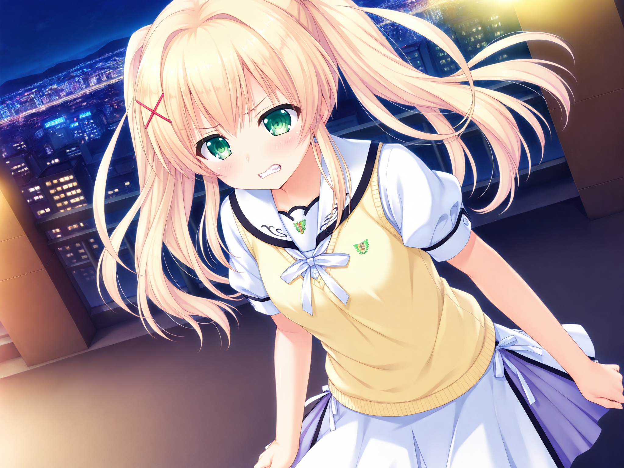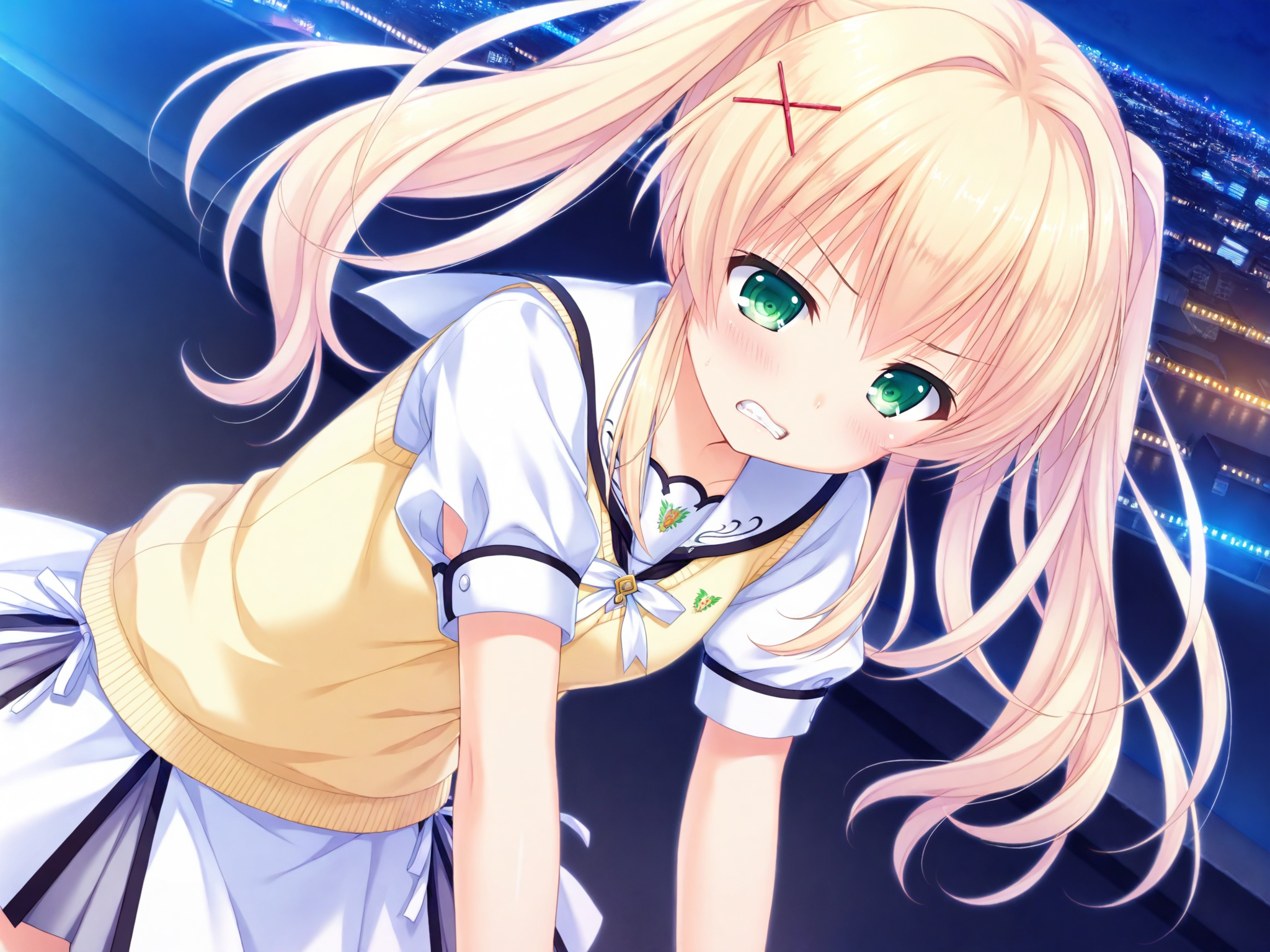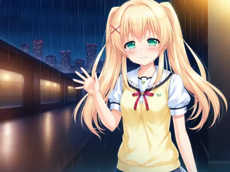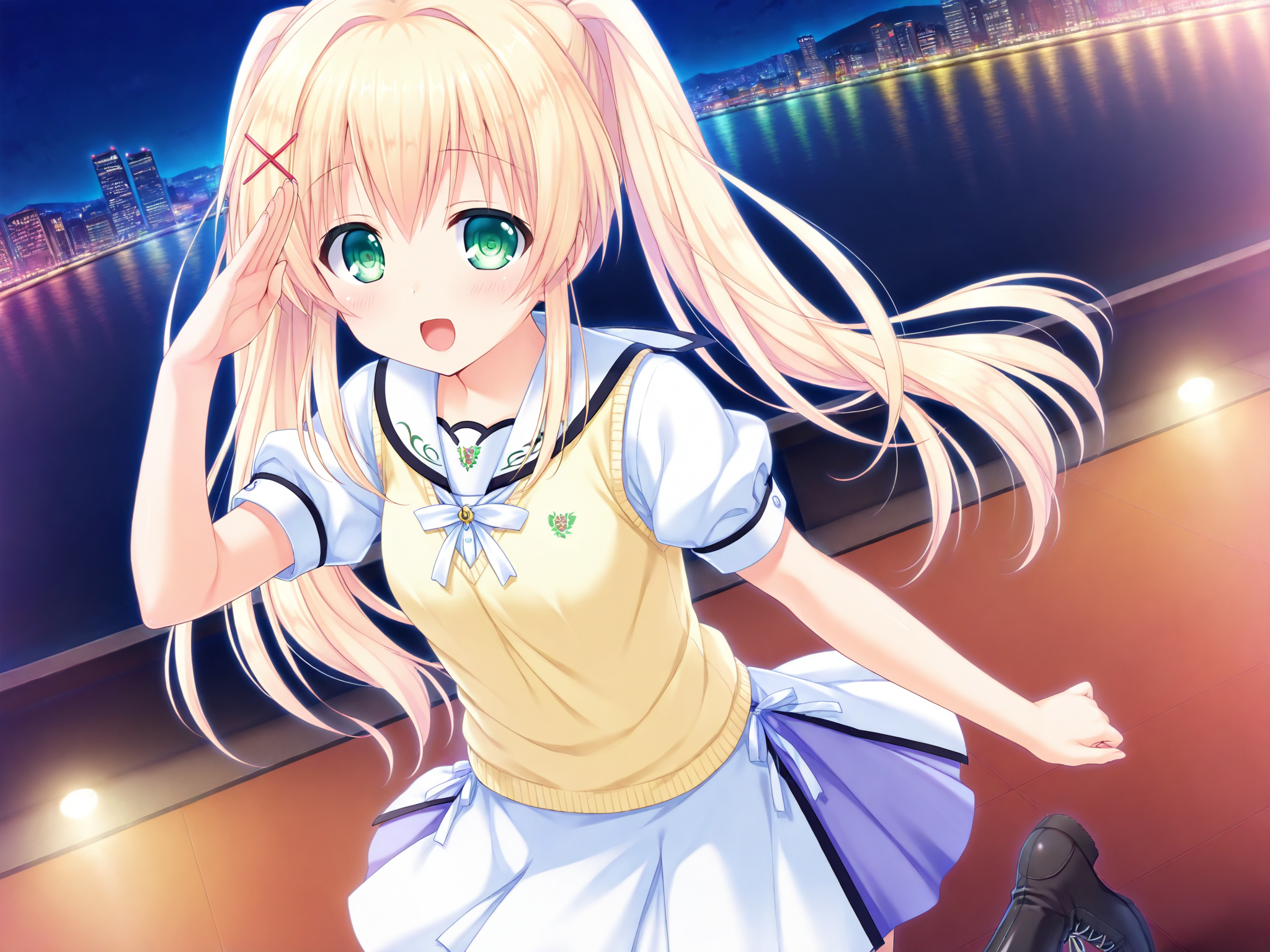 full_shot,game cg,more details,wallpaper,Cinematic Lighting,lora:TsumugiWenders:0.7,1girl,solo,yellow sweater vest,blonde hair,twintails,green eyes,x hair ornament,blush,skirt,white sailor collar,puffy short sleeves,white shirt,miniskirt,sidelocks,cityscape,waving_arms,night,rain,crying,