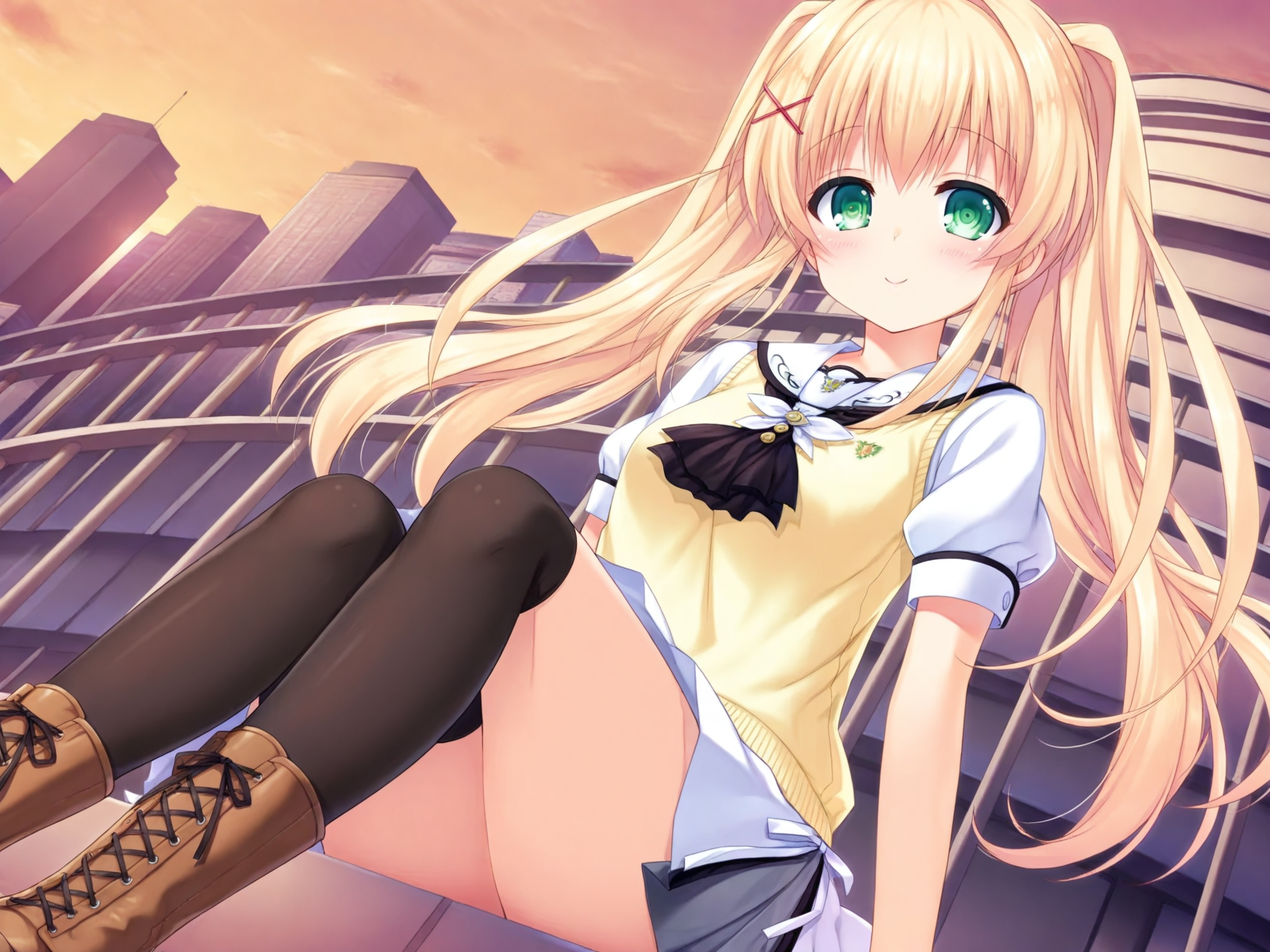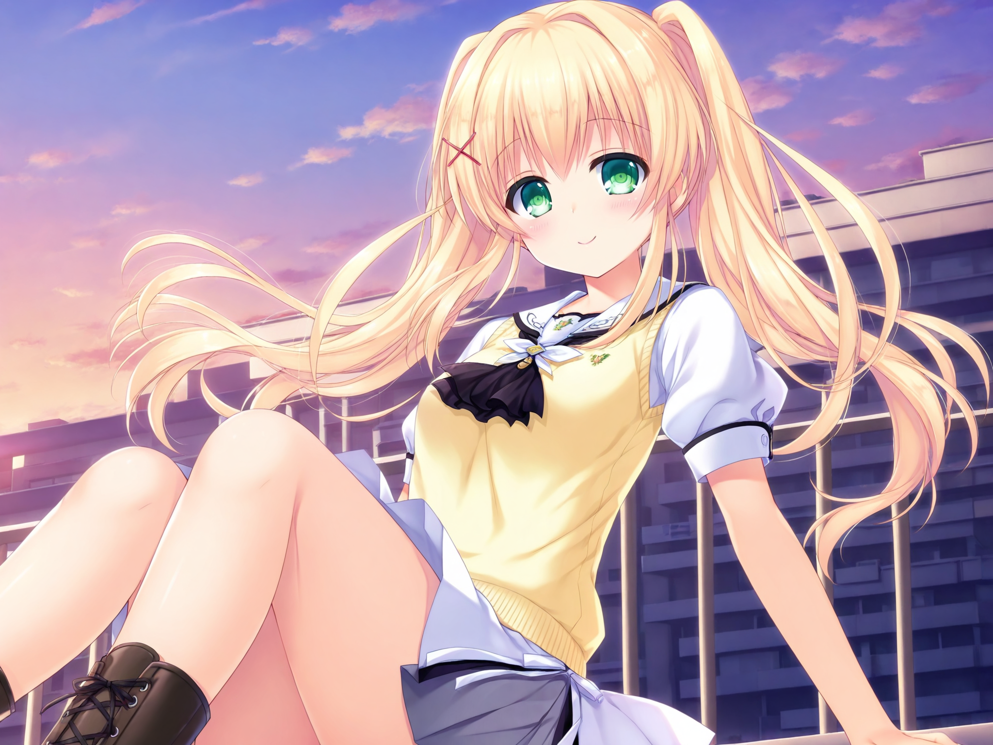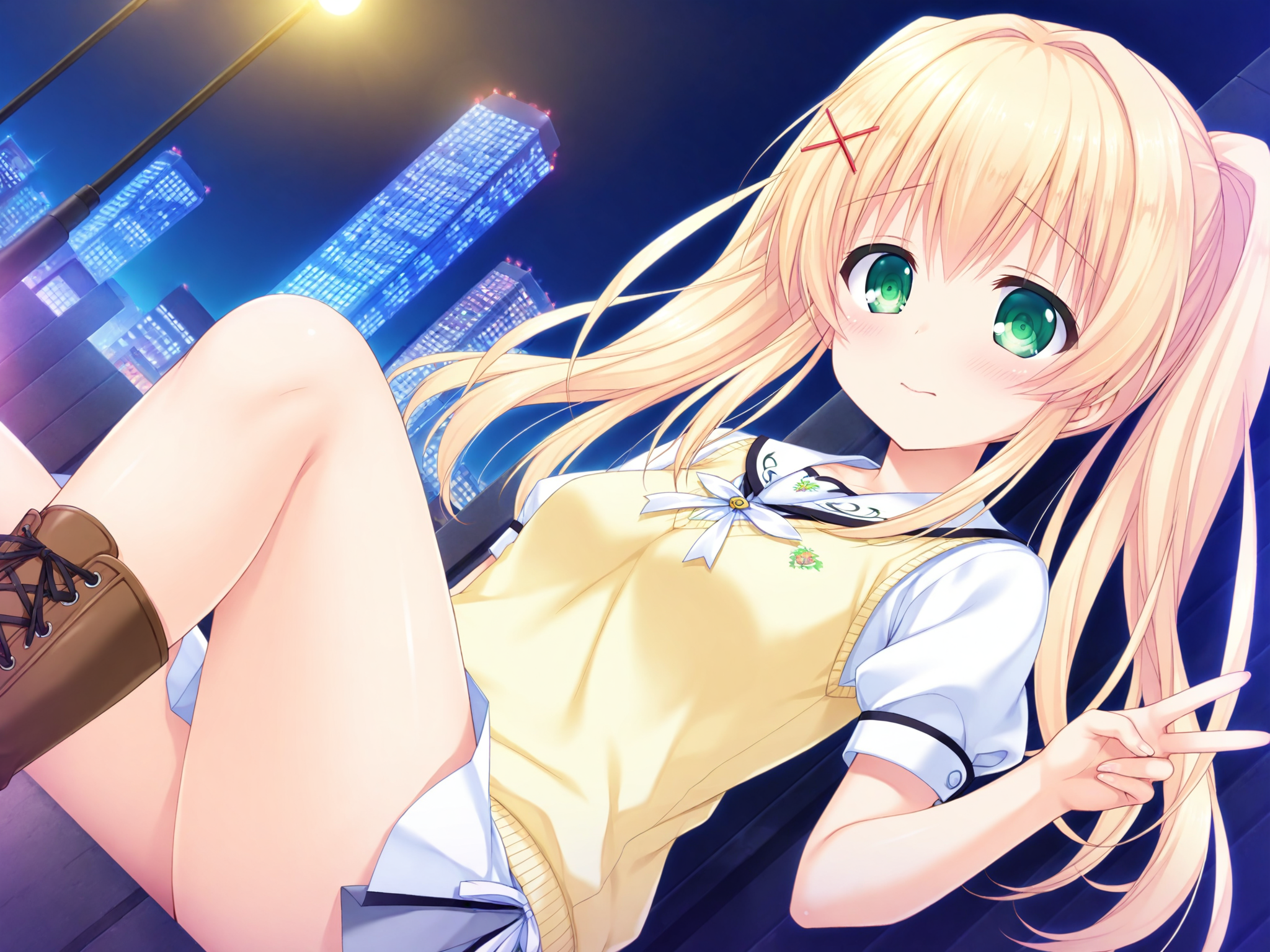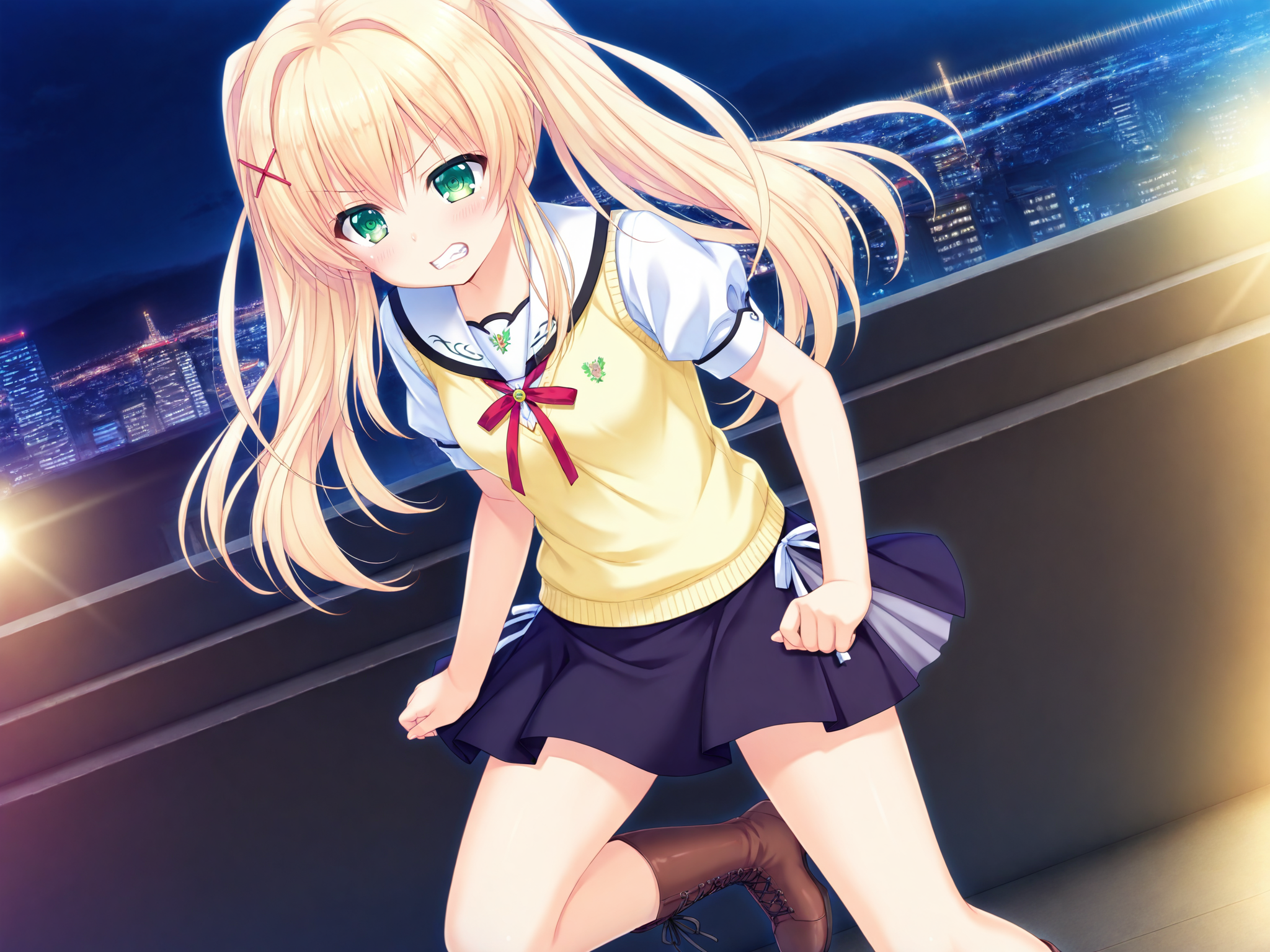 full_shot,game cg,more details,wallpaper,Cinematic Lighting,lora:TsumugiWenders:0.7,1girl,solo,yellow sweater vest,blonde hair,twintails,green eyes,x hair ornament,blush,skirt,white sailor collar,puffy short sleeves,white shirt,miniskirt,sidelocks,cityscape,waving_arms,night,rain,crying,