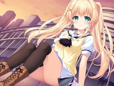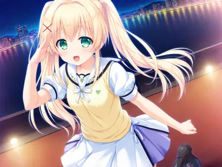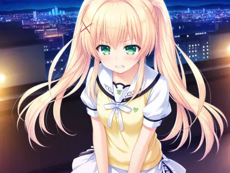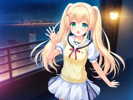 full_shot, game cg, 더 많은 디테일, 배경화면, 시네마틱 조명, lora:TsumugiWenders:0.7, 1girl, solo, 노란 스웨터 조끼, 금발 머리, 듀얼 테일, 녹색 눈, x 헤어 장식, 뺨에 붉은 기, 치마, 흰색 해군 칼라, 볼륨 있는 짧은 소매, 흰 셔츠, 미니 스커트, 옆머리, 도시 풍경, 손을 흔드는, 밤, 비, 울고 있는,