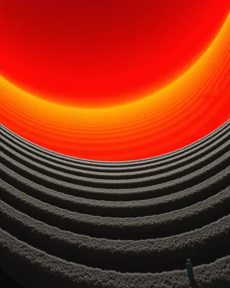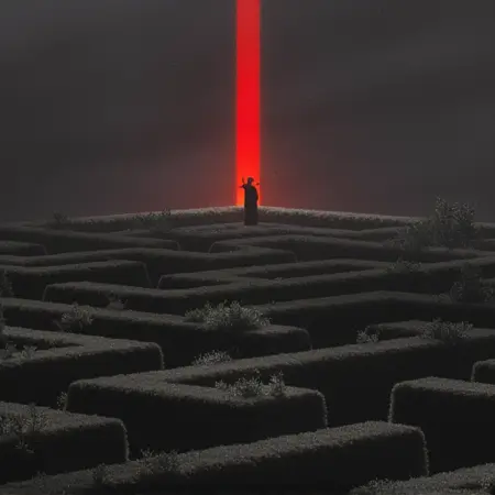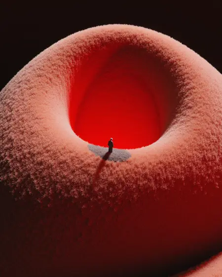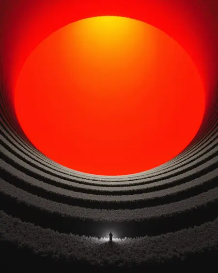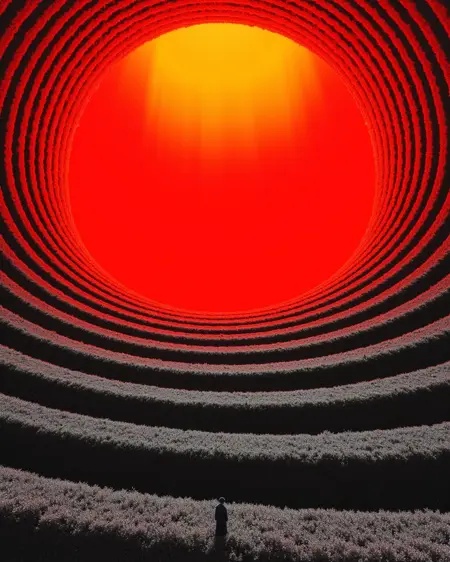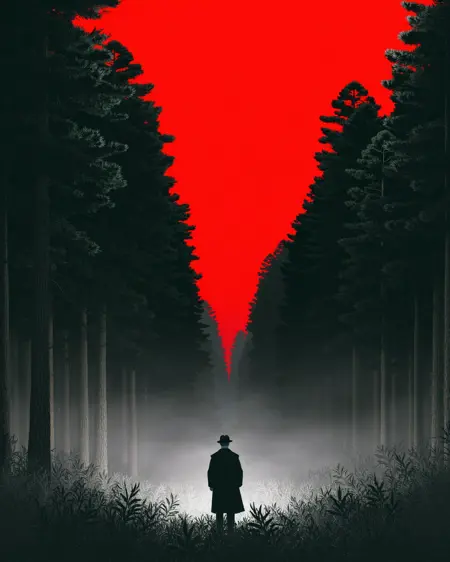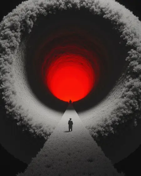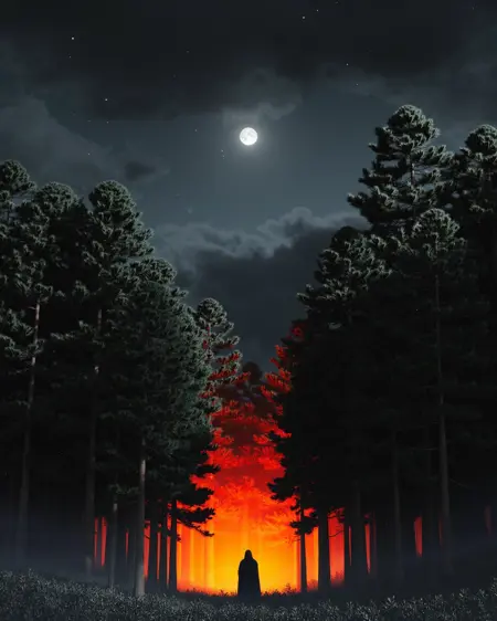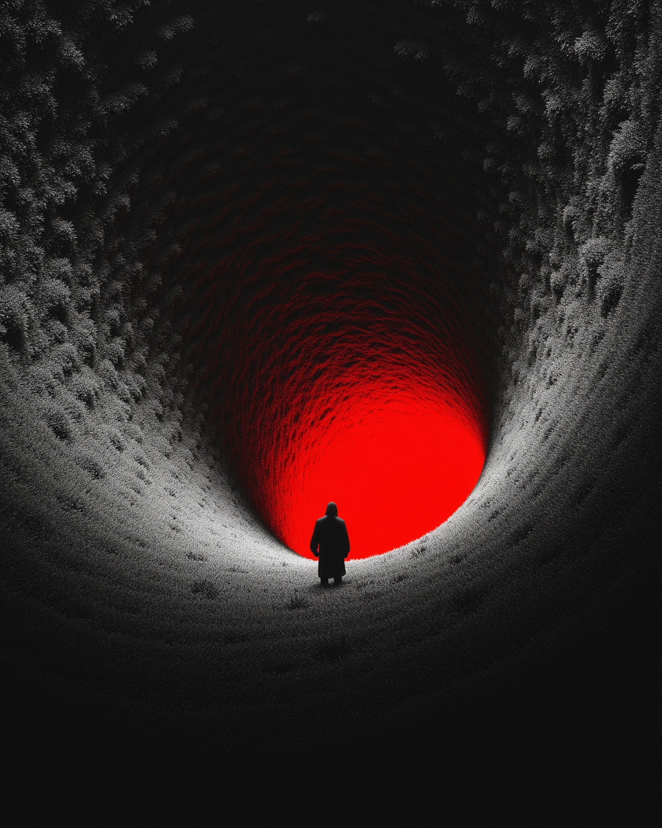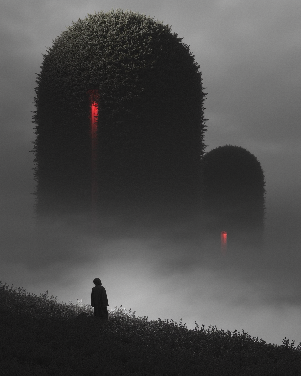 Recommended Tags:Explore Purgatory, eerie, desolate, hellish red glow, colorless grass, colorless sky, fog, a solitary figure, digital artwork, cg image, tall trees, isolating, dreadful, haunting, Surreal
