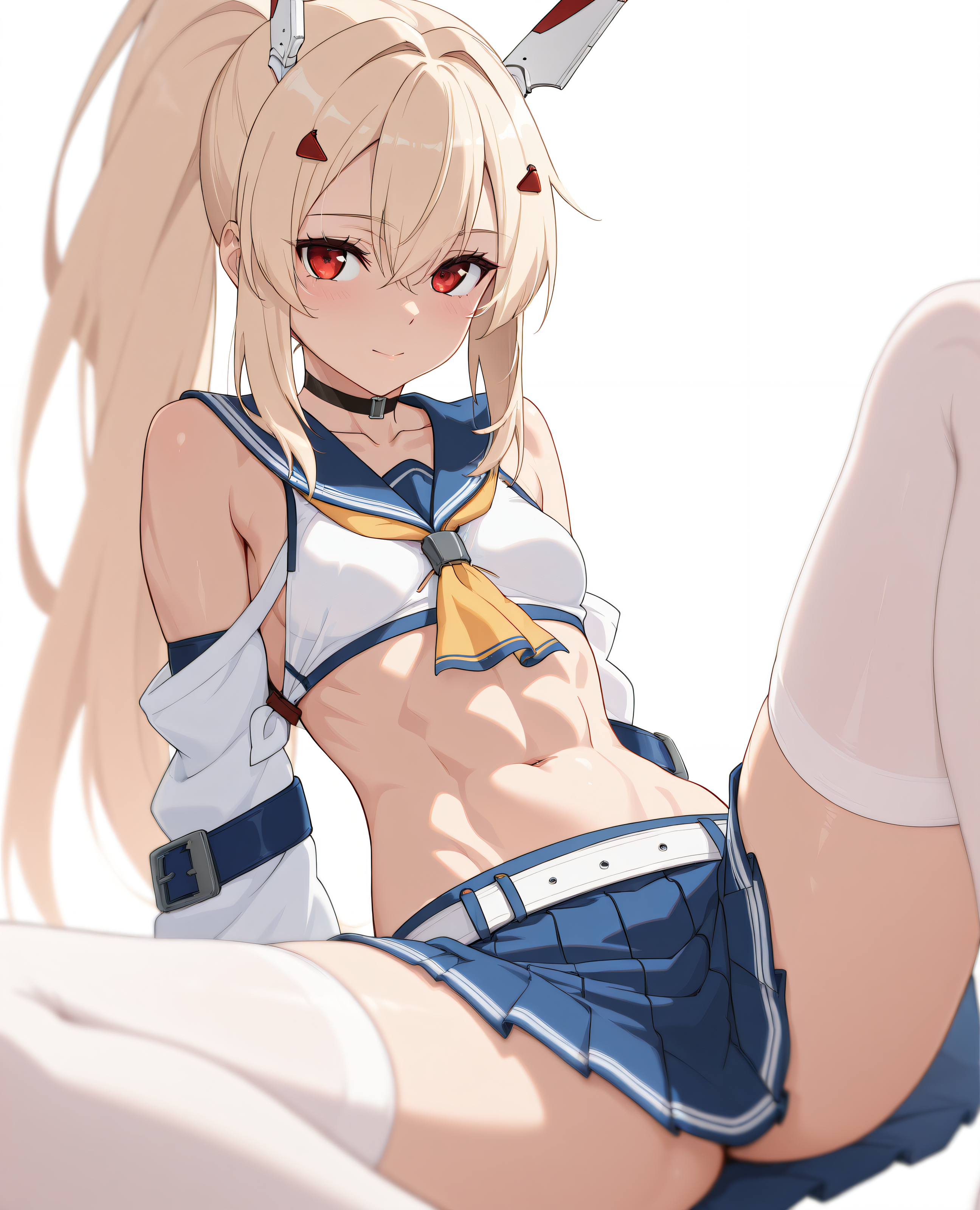 skirt, pleated skirt, belt, blue skirt, thighhighs, white thighhighs,