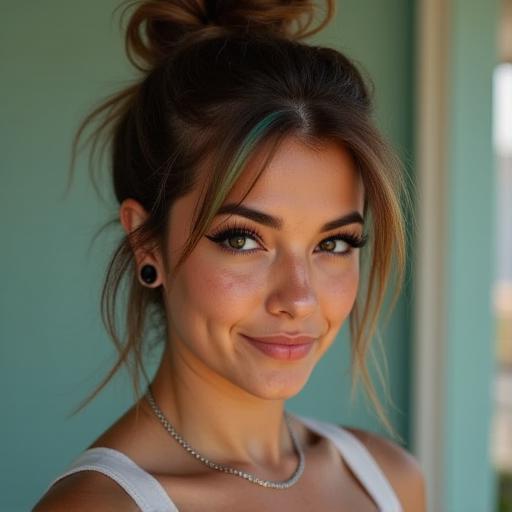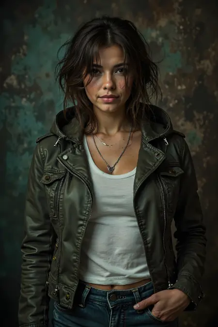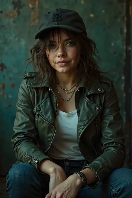 Style Vibe: Urban tomboy with minimalist edge — earth tones, silver chains, scuffed boots, camera always slung at her hip