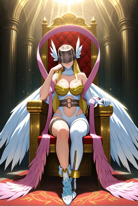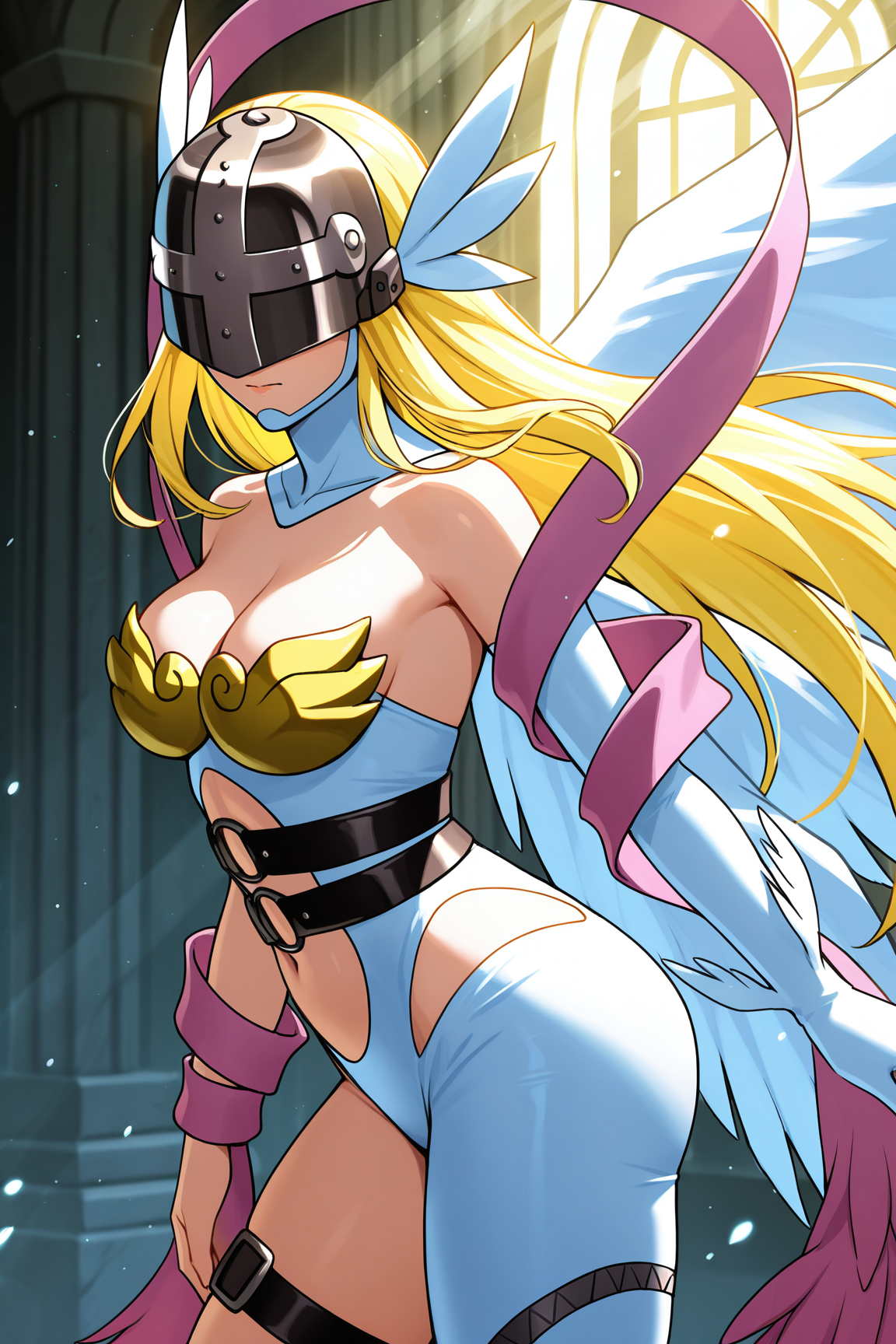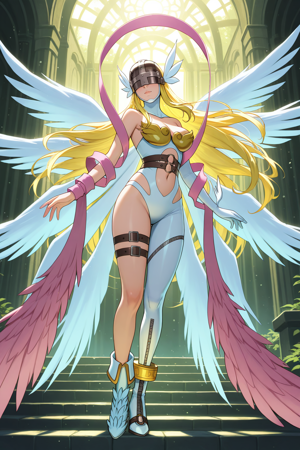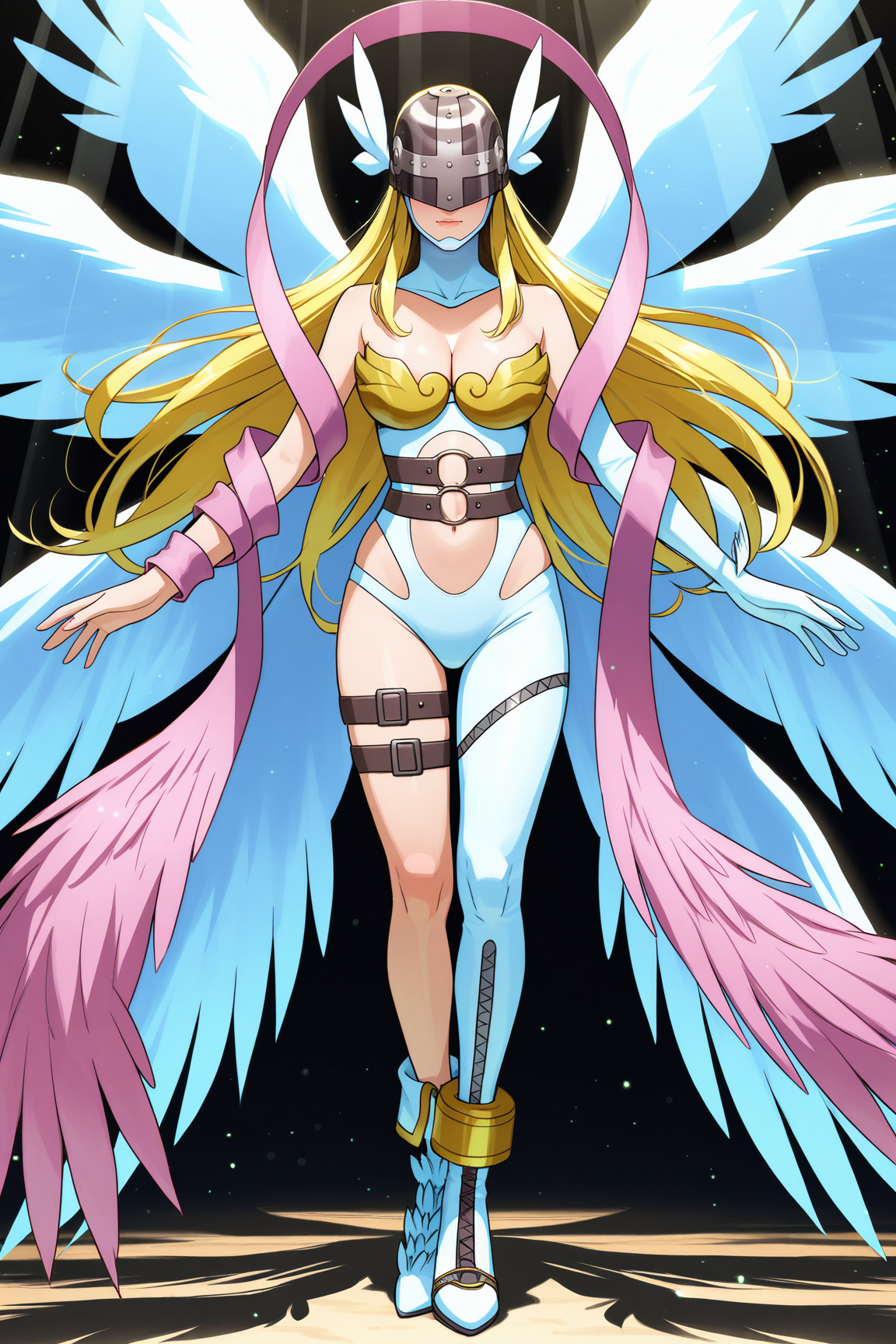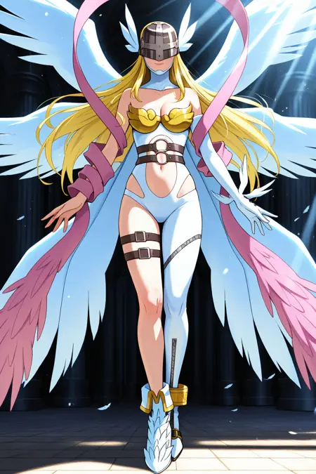 angewomon, 1girl, long hair, blonde hair, navel, closed mouth, cleavage, bare shoulders, medium breasts, collarbone, sidelocks, wings, belt, white glove, thigh strap, high heels, white footwear, head wings, feathered wings, o-ring, angel wings, white wings, shawl, angel, covered eyes, asymmetrical clothes, stomach cutout, single elbow glove, multiple wings, hagoromo, winged helmet, asymmetrical footwear, mismatched footwear