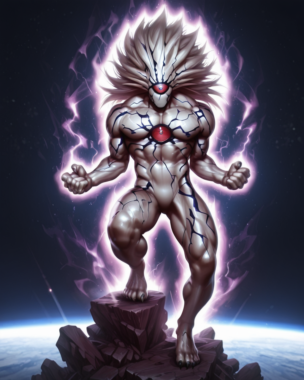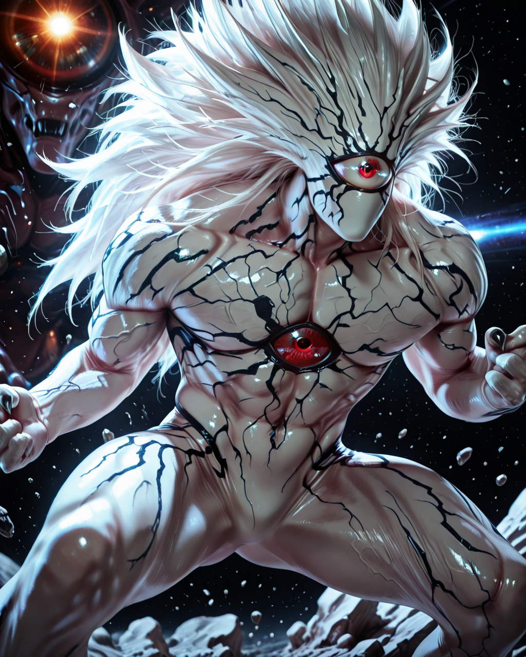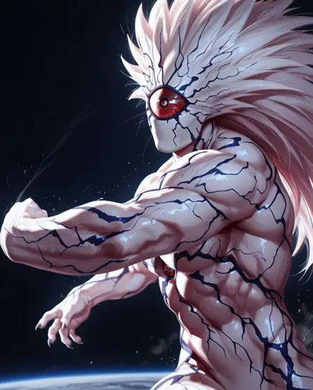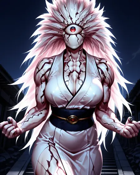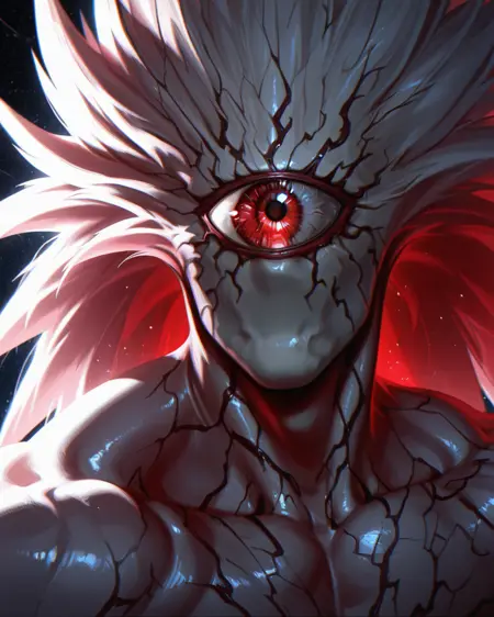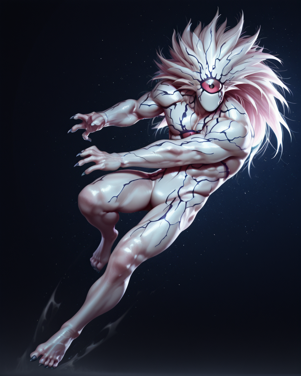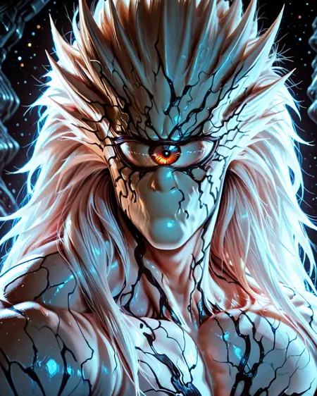 one big eye, no mouth, white skin, white hair, long hair, needle hair, alien, claws, monster, no human, muscular, blue veins all over the body