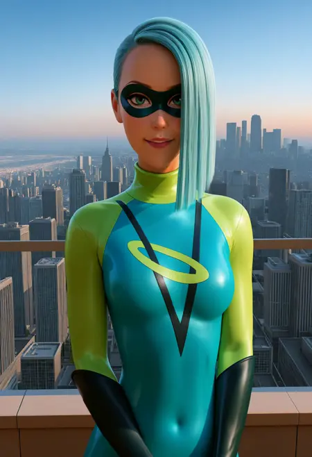 Keywords: voydtheincr, aqua hair, asymmetrical hair, medium hair, hair over one eye, domino mask, green eyes,green mask , two-tone bodysuit, green bodysuit, blue bodysuit, skin tight, logo, turtleneck, elbow gloves, green legwear
