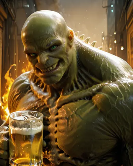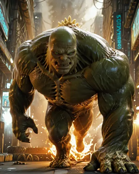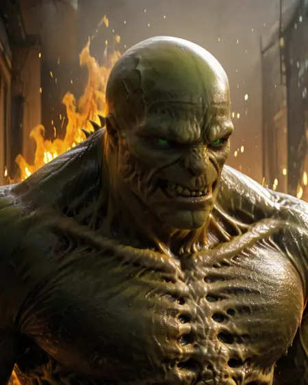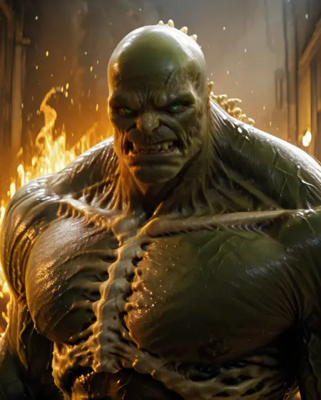green-yellow skin tone, green eyes, bone spikes, bald head, protruding spine, very muscular