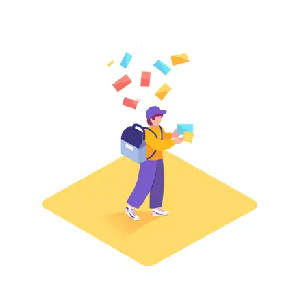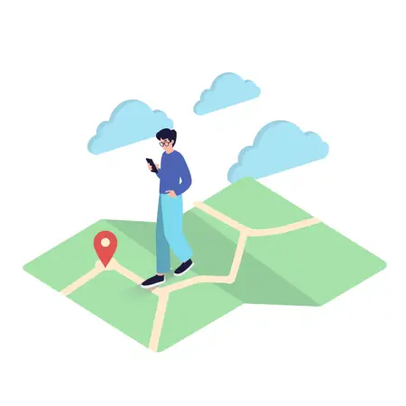 提示词二:a man with dark hair, wearing glasses, a blue long-sleeved shirt, light blue pants, and black shoes, is standing on a green map, which has beige roads on it, he is holding a smartphone in his right hand and seems to be checking directions, there is a red location marker on the left side of the map, in the background, there are two translucent blue clouds floating, using flat color, with very few shadows
