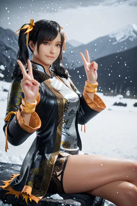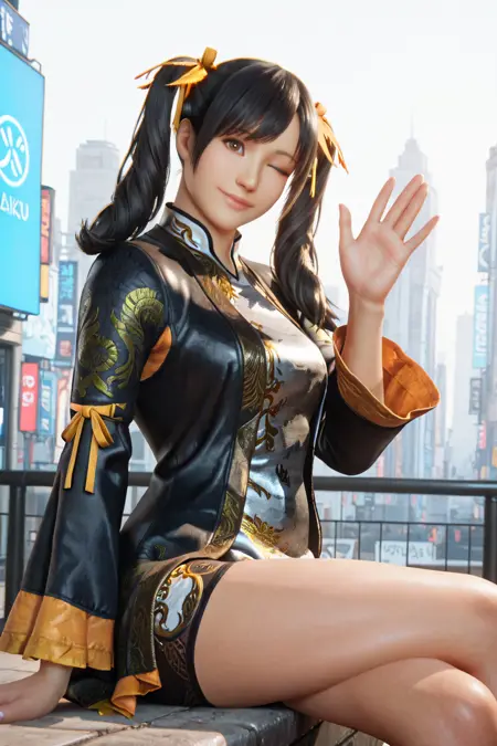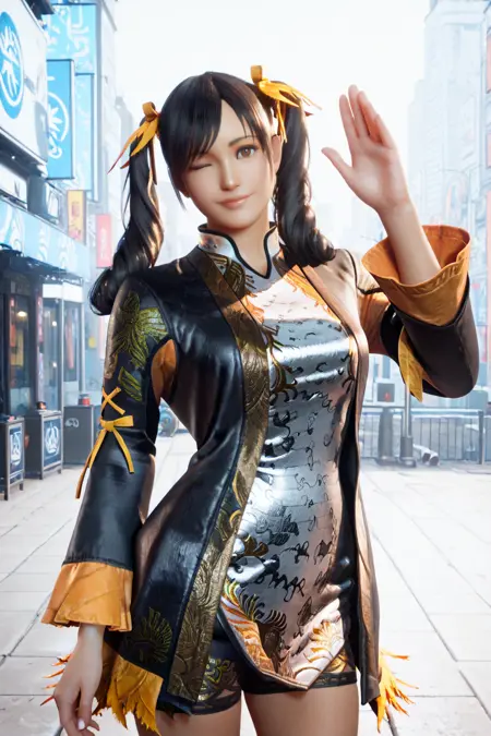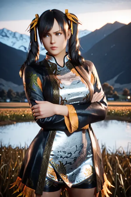 Ling Xiaoyu, long hair, black hair, twintails, brown eyes, asian, shirt, long sleeves, hair ornament, ribbon, hair ribbon, open clothes, shorts, open jacket, black jacket, black shorts, chinese clothes, short dress, bike shorts, china dress, yellow ribbon