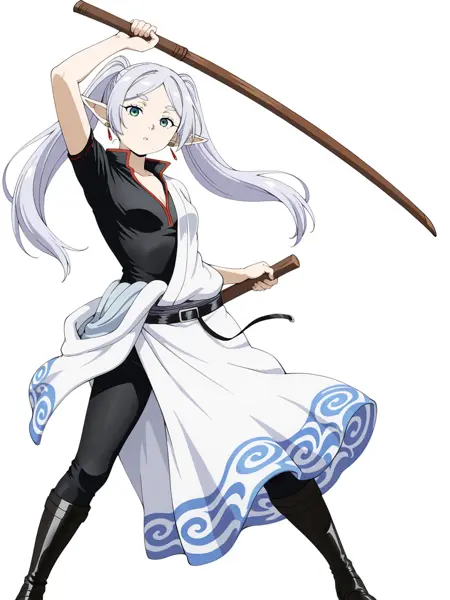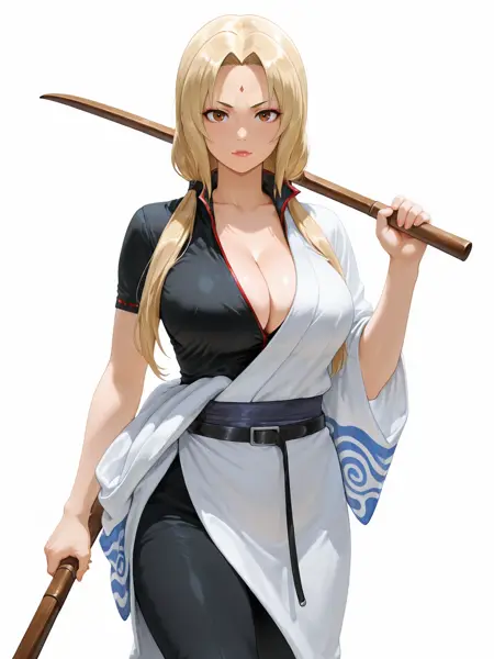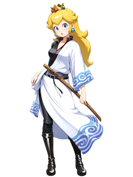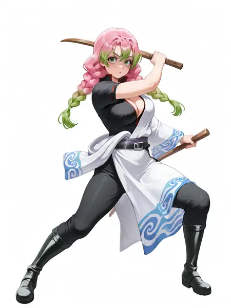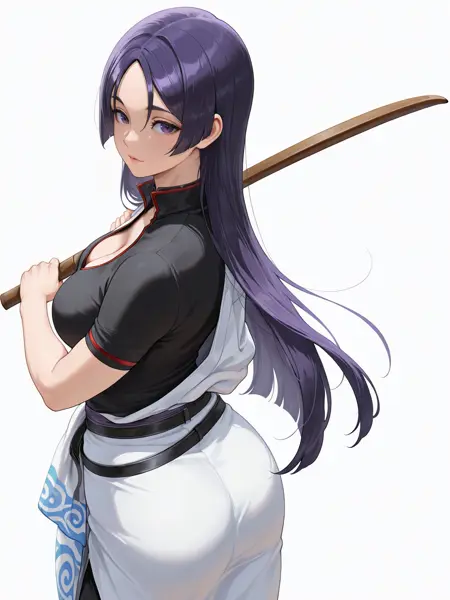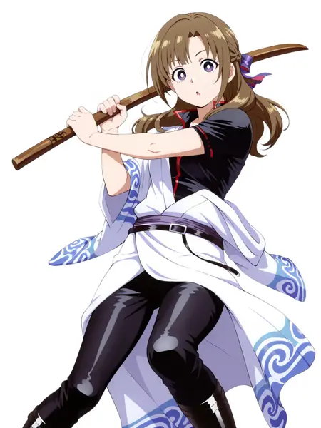 Triggers: outfit_gintoki, gintoki_cosplay, hadanugi dousa, black shirt, black knee boots, black pants, black belt, (bokken:1.4), wooden sword