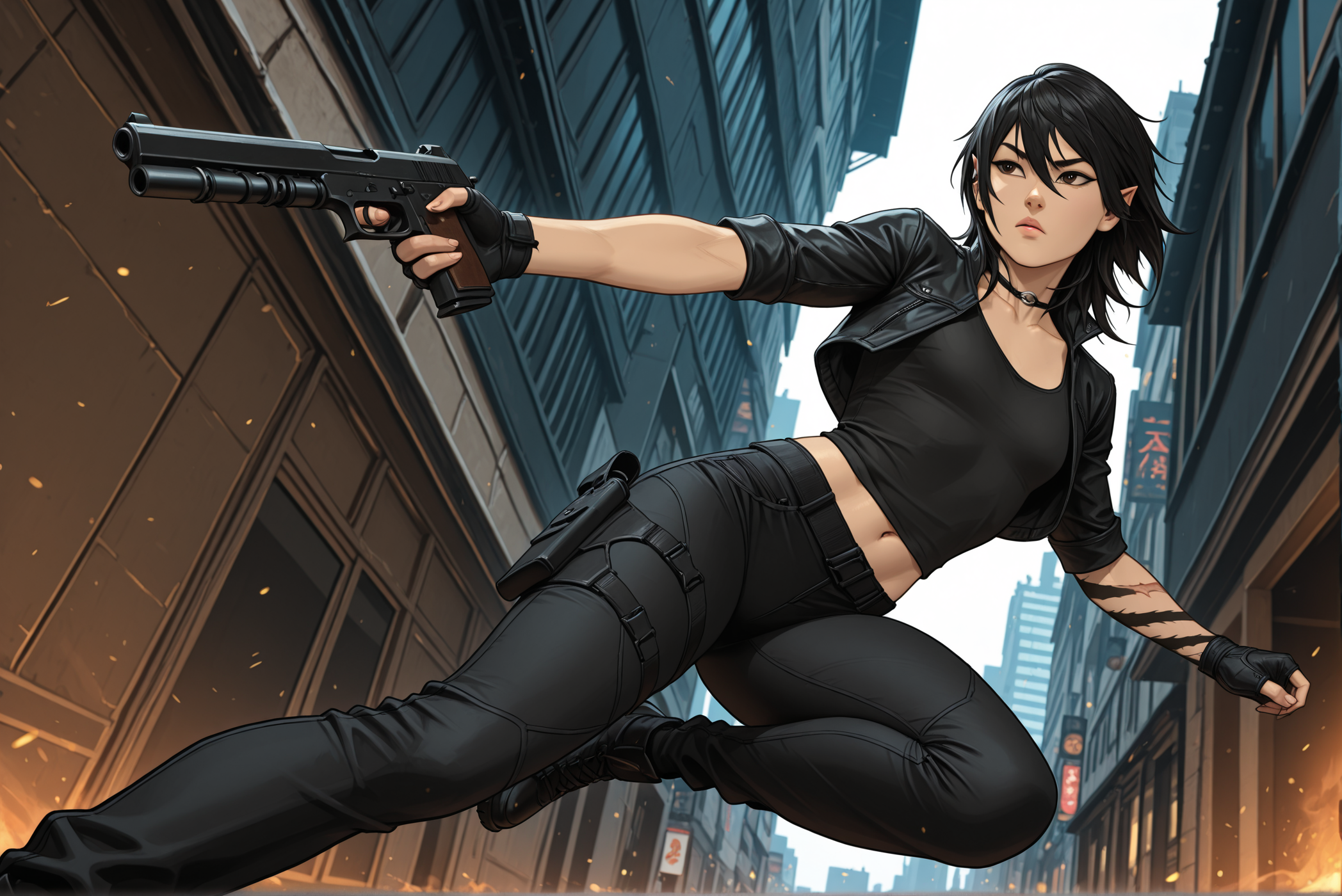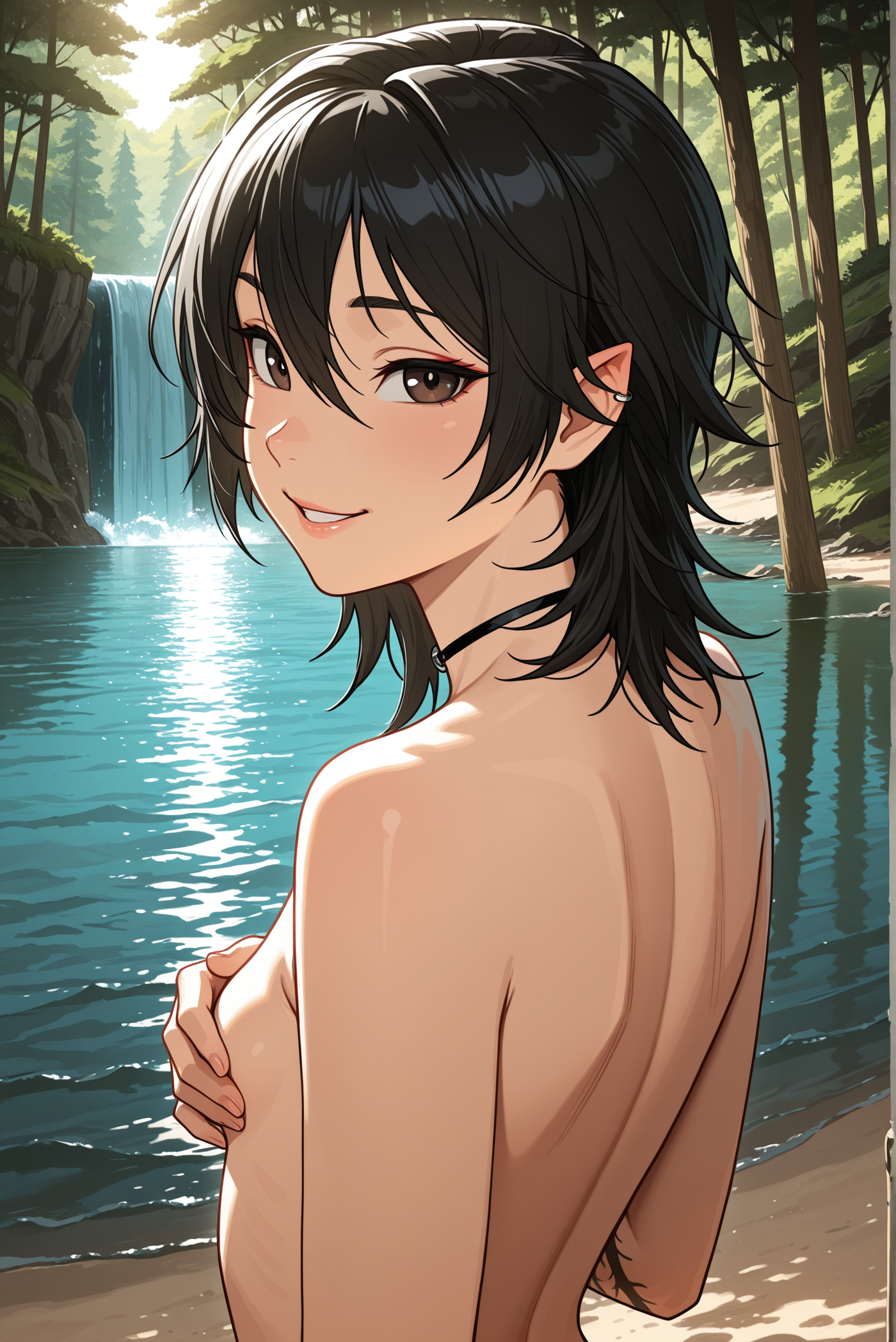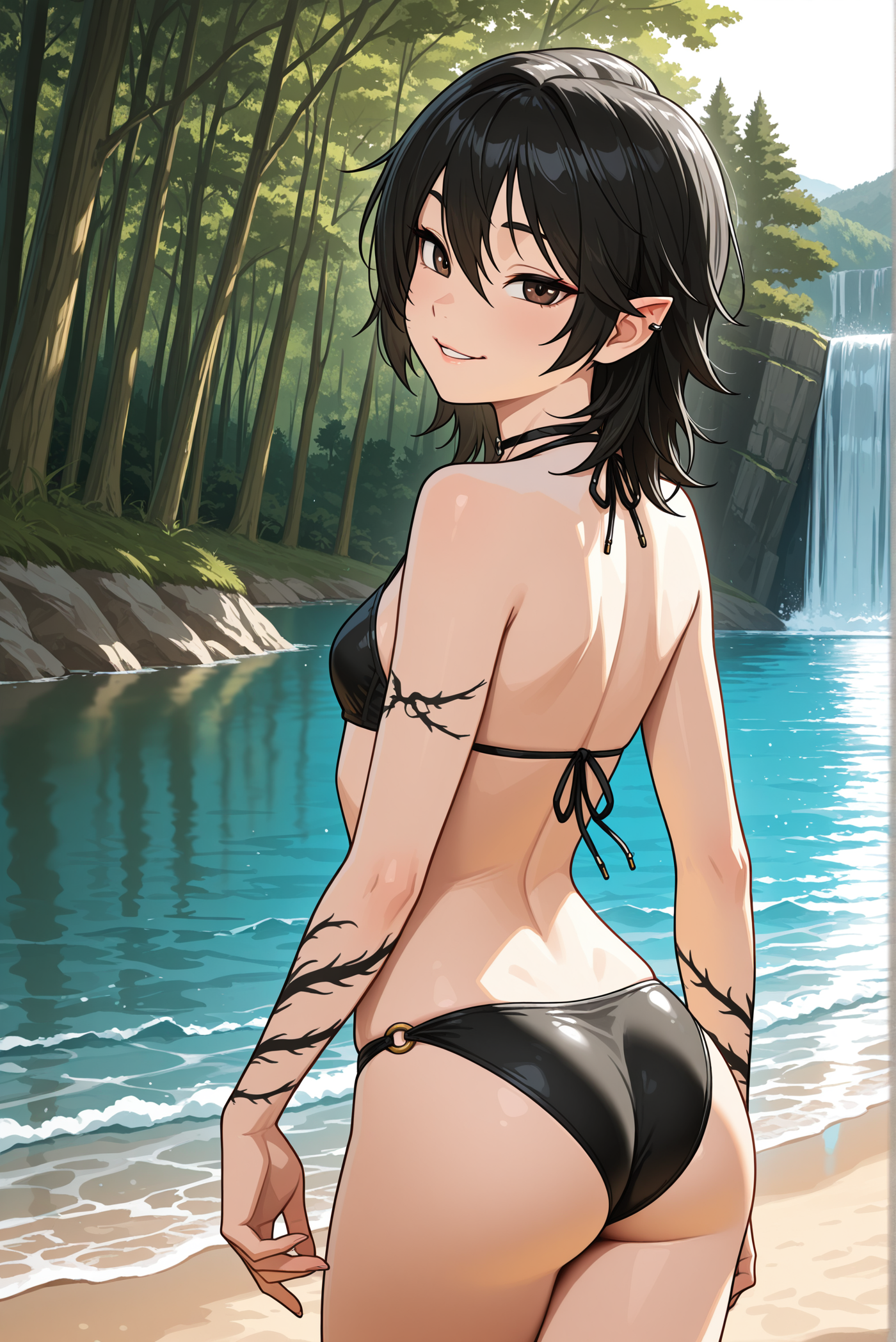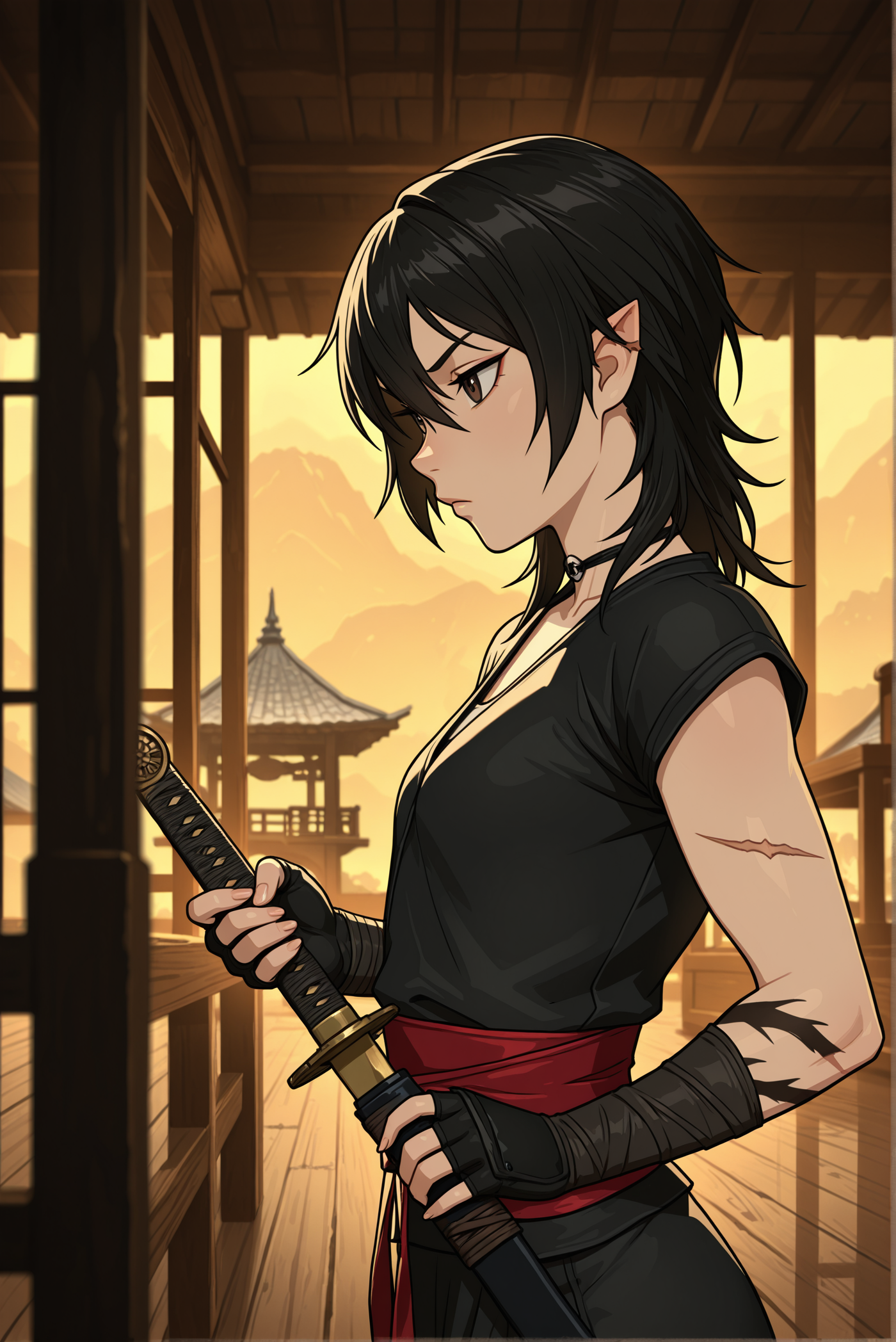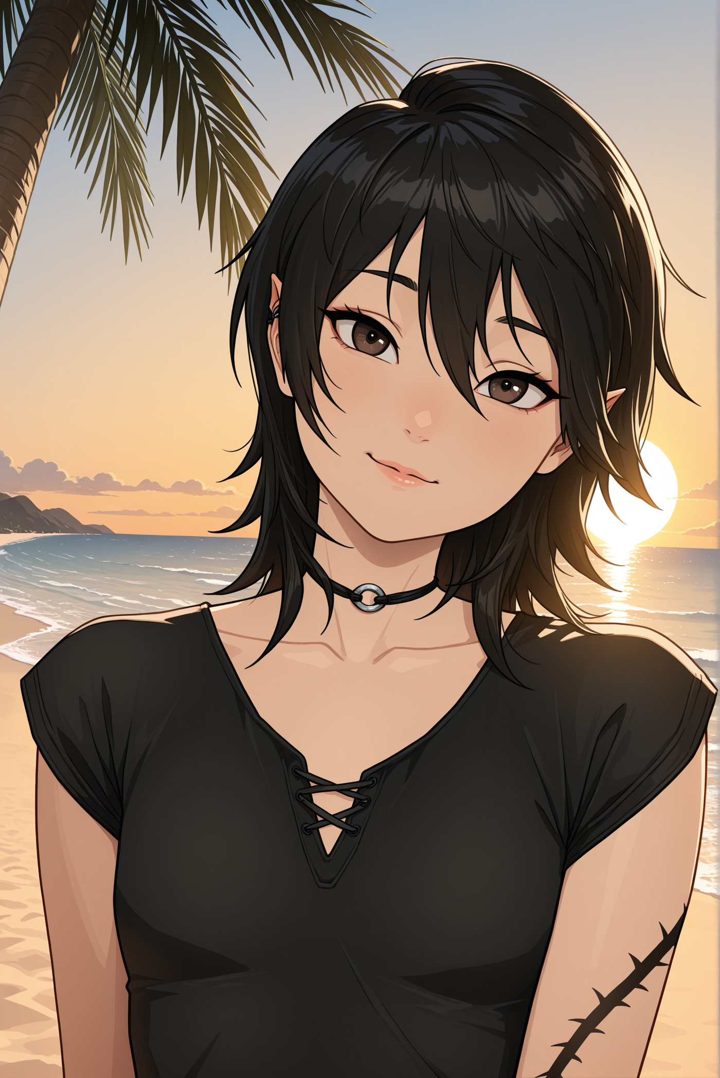 1girl, asian, ku-mi, black hair, pointy ears, forearm tattoo, dark brown eyes, small breasts, black hair, choker, medium hair,