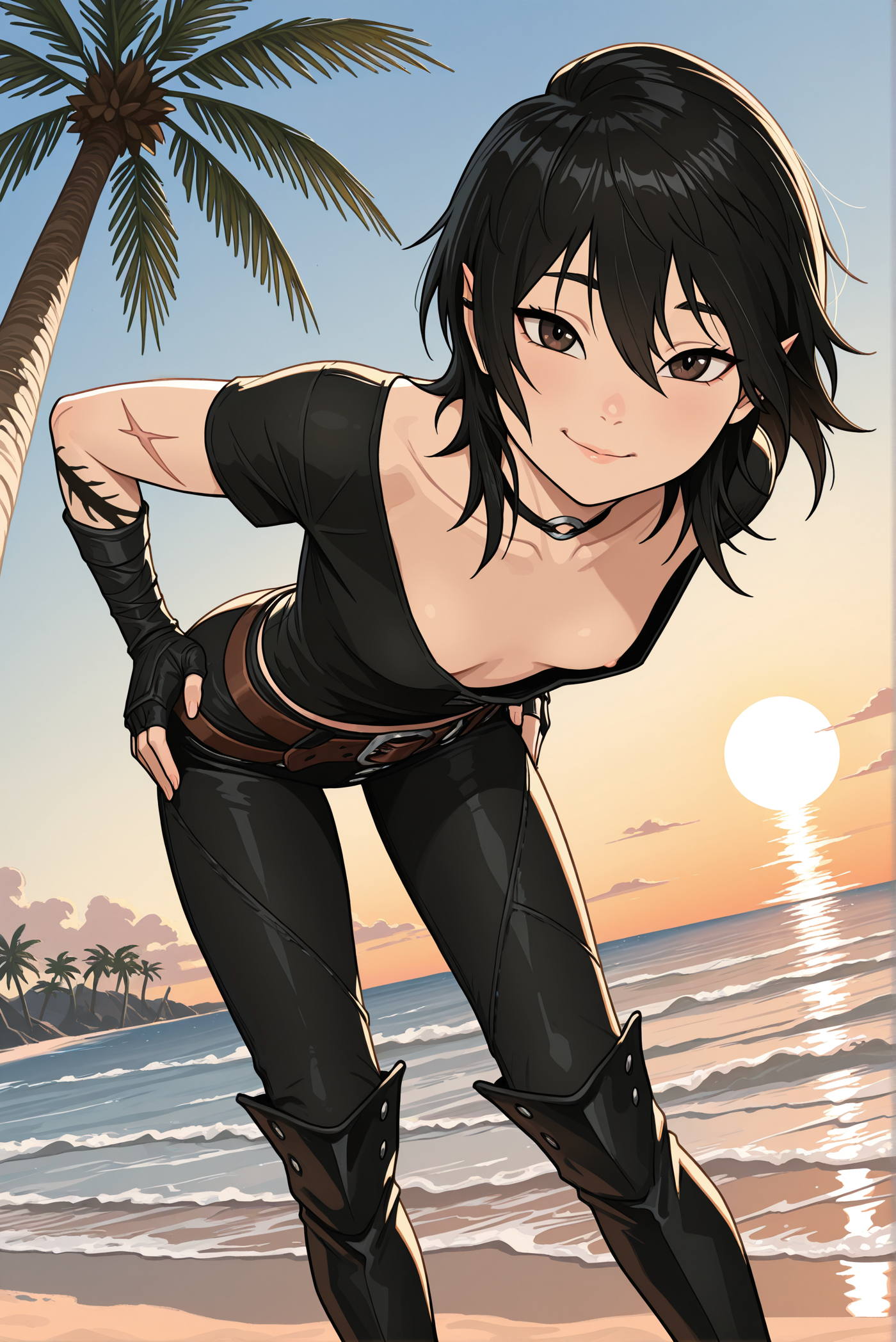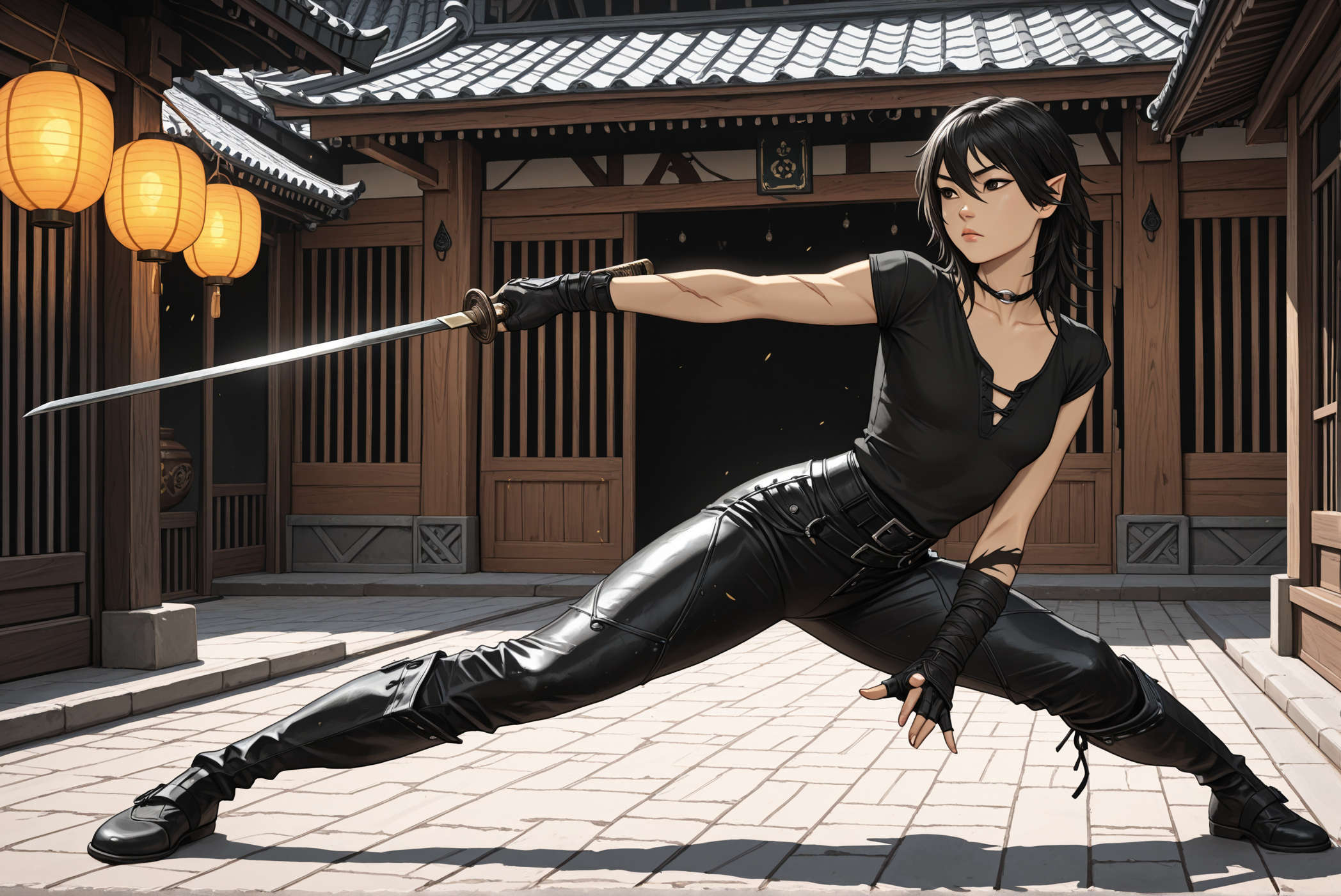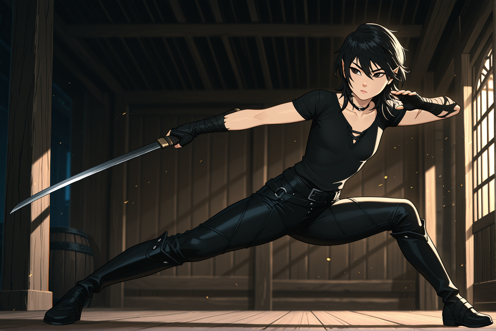 black shirt, black medieval pants, leather pants, dark blue over-the-knee boots,