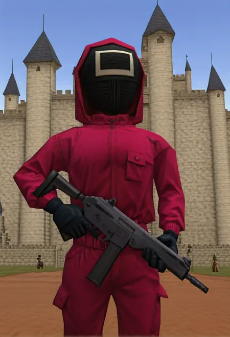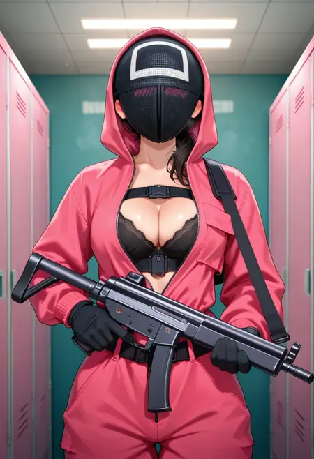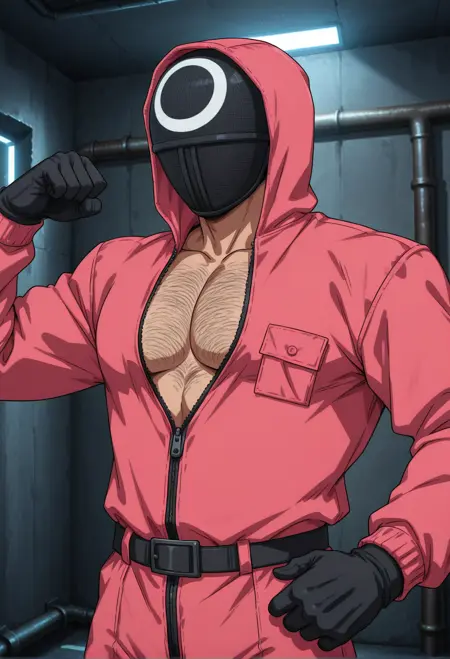 完全な服装: worker \(squid game\) + サークルマスク、トライアングルマスク、またはスクエアマスク + ホッディー付きピンクのジャンプスーツ、ベルト、黒い手袋、ブーツ