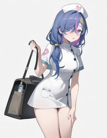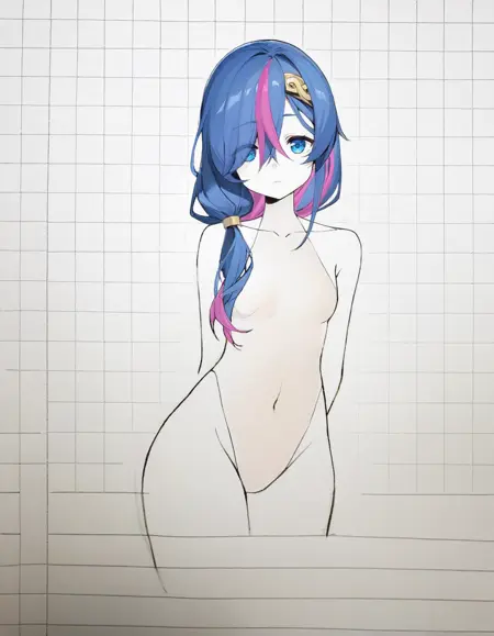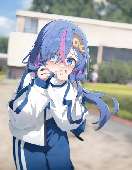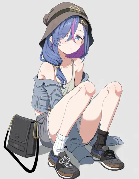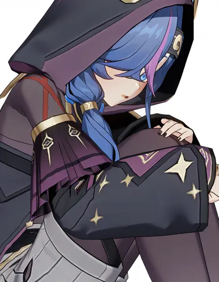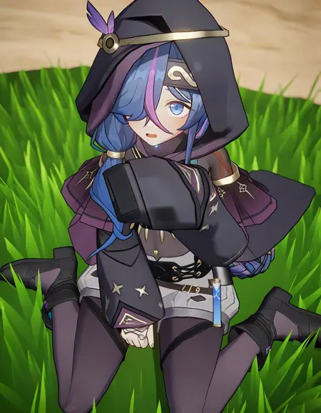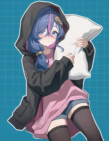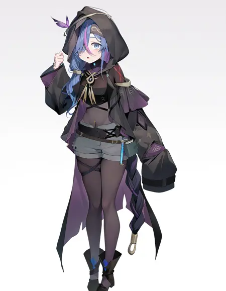 xingyi,1girl,solo,blue hair,blue eyes,multicolored hair,streaked hair,eyes visible through hair,long hair,bangs,hair over one eye,purple hair,pink hair,feathers,hood,covered navel,piercing,long sleeves,shorts,pantyhose,