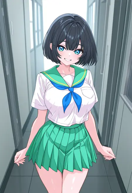 School Uniform : serafuku,pleated skirt,green skirt,kneehighs,loafers,