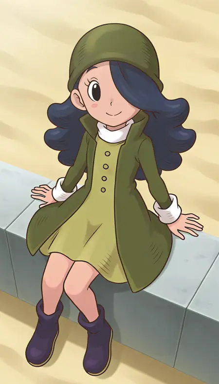 복장: 녹색 헤드웨어, 모자, 코트, 여는 코트, 높은 칼라, 긴 소매, 단추, 흰색 칼라, 드레스, 신발