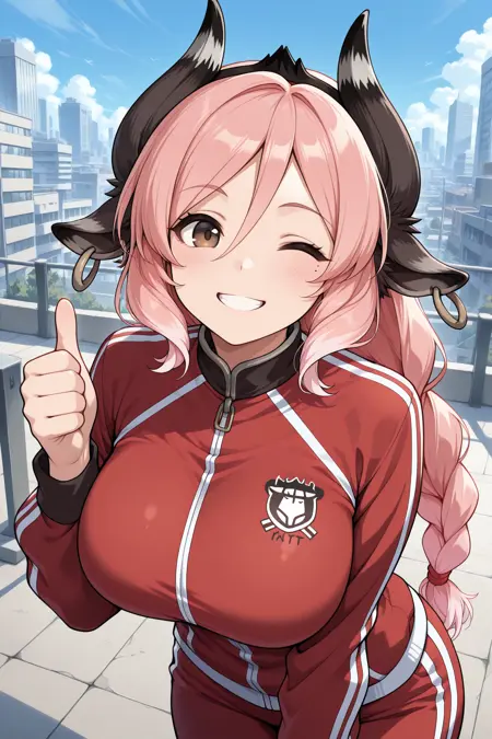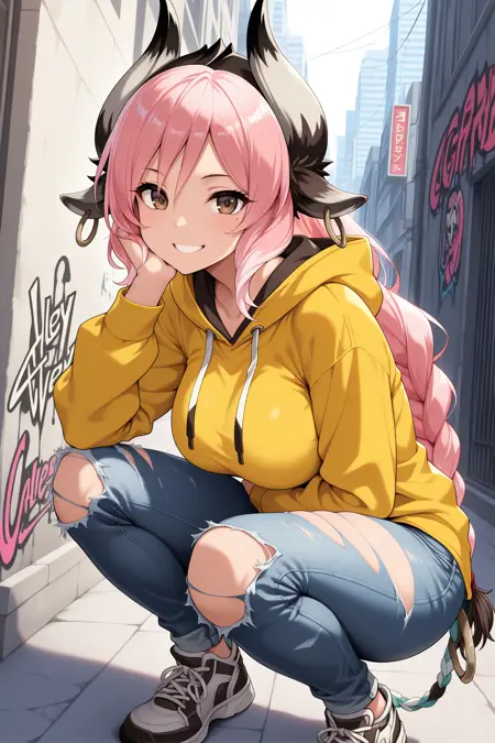 트리거 단어는 "ysrbll"이며, "분홍색 머리카락, 단일한 땋은 머리, 긴 머리카락, 갈색 눈, 소 뿔, 소 귀"가 필요합니다.
