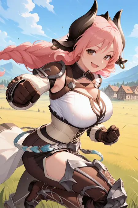 그녀의 전형적인 외모를 위해 "고리 귀걸이, 눈 밑 주근깨, 큰 가슴, 흰 셔츠, 주름 셔츠, 가슴 드레싱 컷아웃, 베이지색 소매, 하네스, 베이지색 코르셋, 한쪽 어깨보호대, 장갑, 갈색 장갑, 갑옷 다리 보호대, 갈색 바지, 허벅지 컷아웃, 갈색 부츠"를 추가하세요.