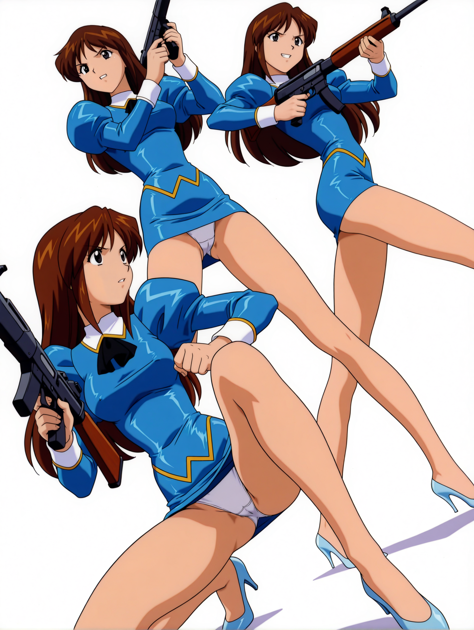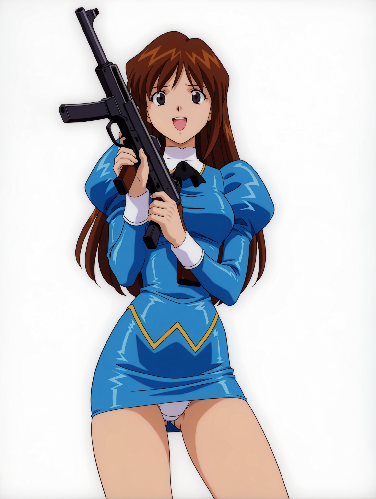 衣装ワード ・b_clothes,black ascot,blue dress,juliet sleeves,long sleeves,blue pencil_skirt,white panties,no socks,blue high heels,