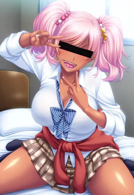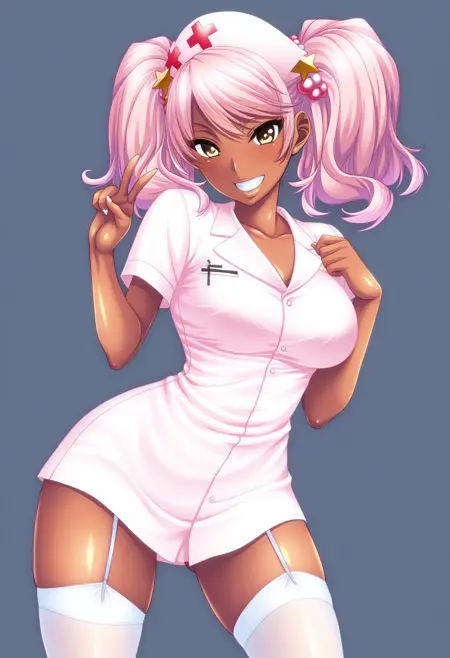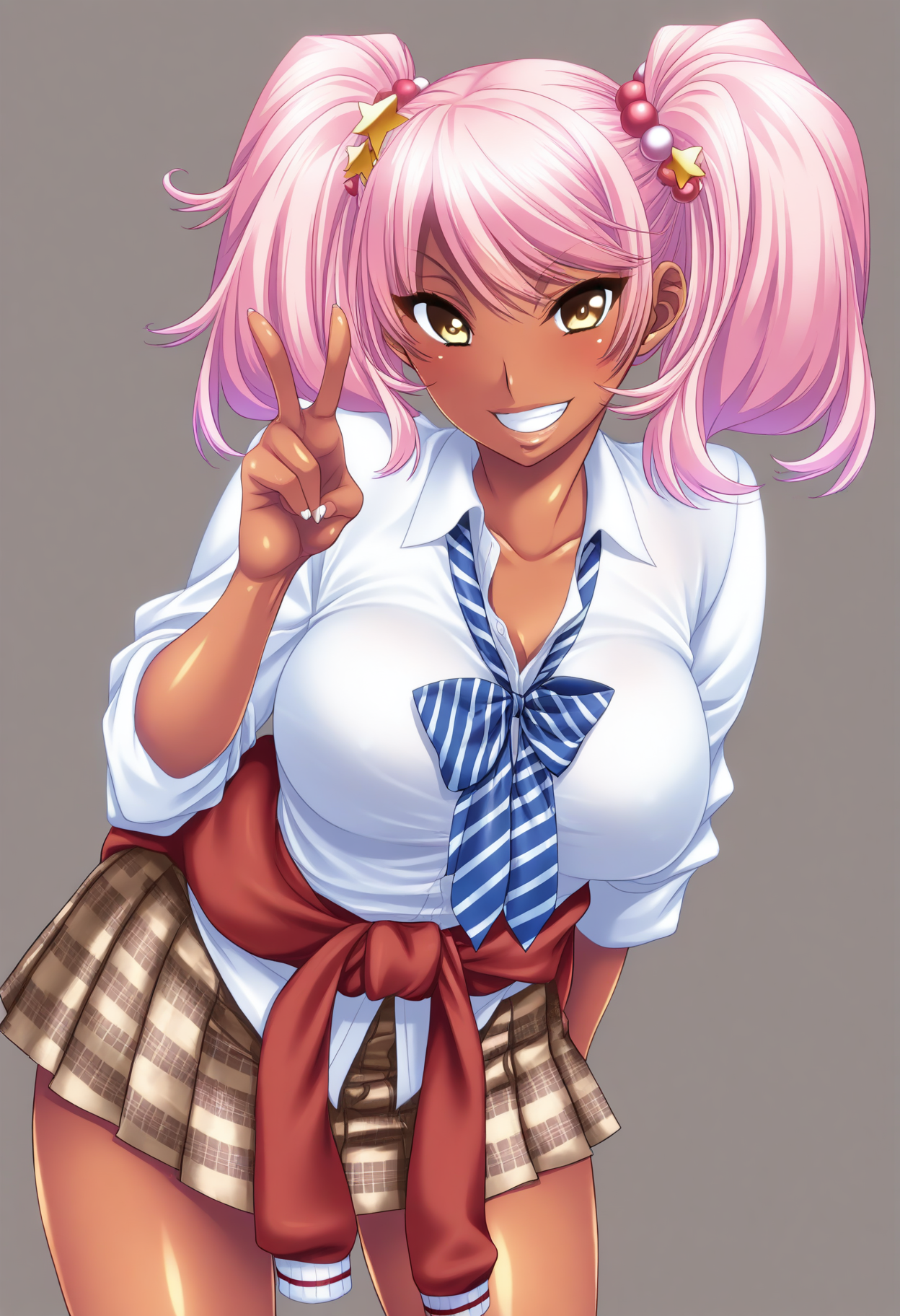 Triggerwords: dark-skinned female, c-miha, pink hair, short twintails, yellow eyes, star hair ornament, hair bobbles,