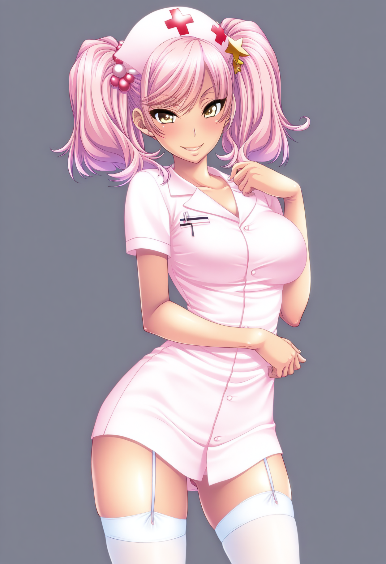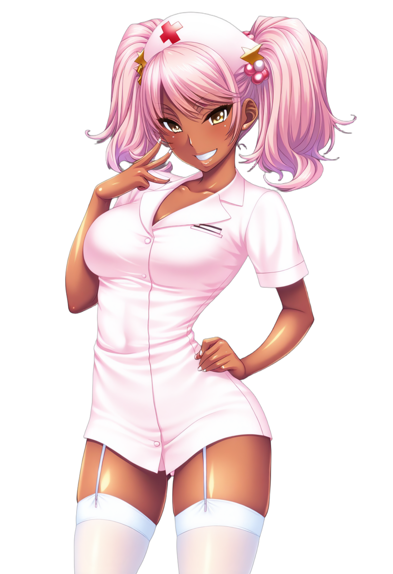 Clothing: nurse cap, pink short dress, short sleeves, white thighhighs, garter straps,