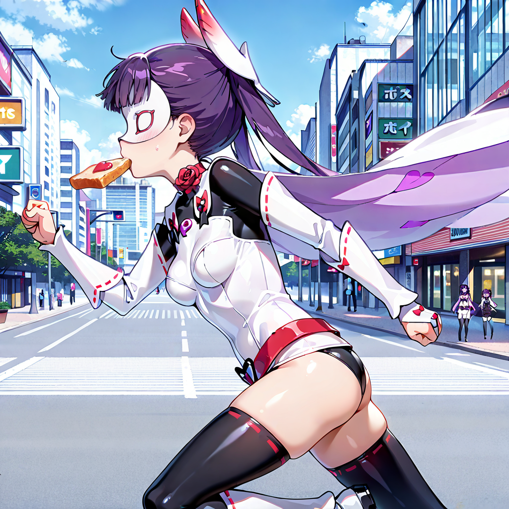 For White Robin: whiterobinil, purple hair, twintails, bodysuit, mask, breasts, black panties, thighhighs, cape with hearts, ribbon-trimmed sleeves, ribbon-trimmed legwear, rose choker, magatama,