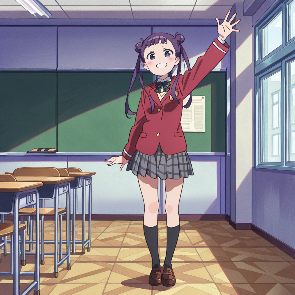For Renge in school uniform: komarengeil, school uniform, purple hair, purple eyes, twintails, breasts, double bun, zettai_ryouiki, grey bowtie, grey frilled skirt,