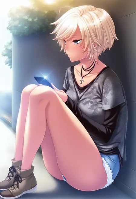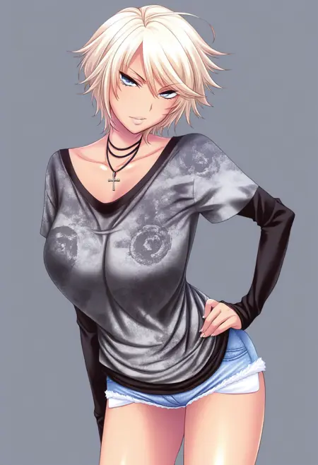 Clothing: cross necklace, grey shirt, black sleeves, cutoffs, short shorts,