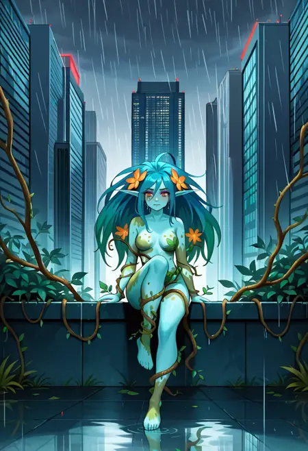 HOMMPixie, green_hair, multicolored_hair, 1girl, plant_girl, blue_skin, blue_hair, long_hair, pointy_ears, glowing_skin, barefoot, vines, leaf, hair_flower, minimal_clothing, vitiligo, orange eyes, eyeshadow,
