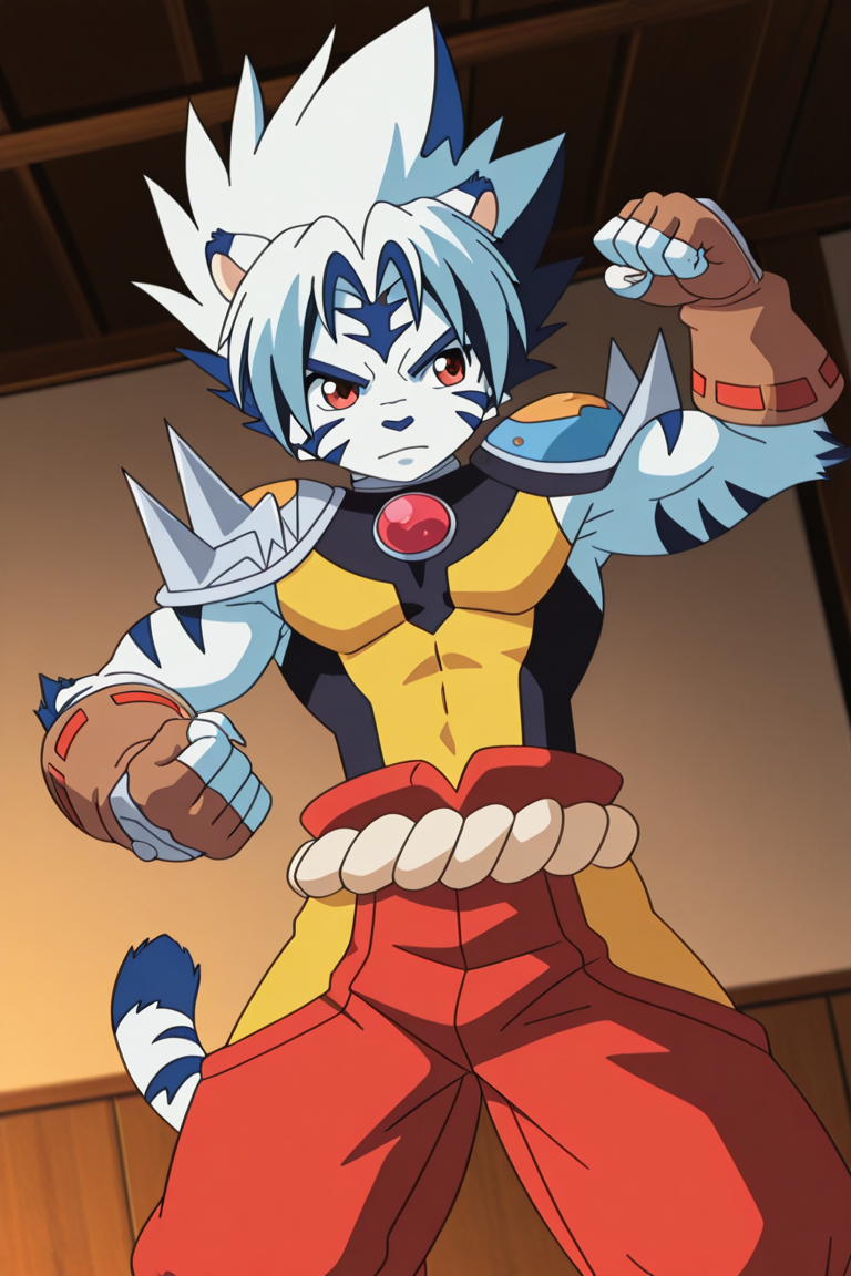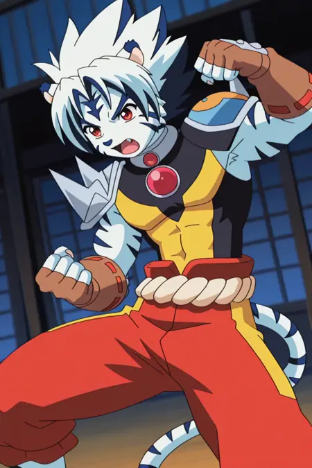 kogenta, red eyes, white fur, tiger boy, tiger ears, tiger stripes, furry, furry male, yellow and black tank top, chest jewel, brown fingerless gloves, shoulder armor, orange pants